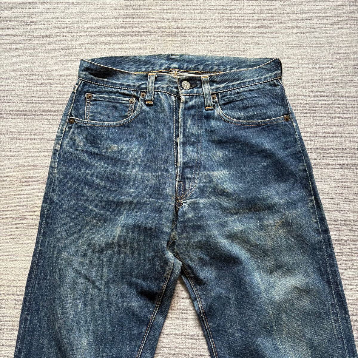 隠しリベット銅製、パッチは残っておりませんがディテールよりレザーパッチの年代です。ボタンフライのボタンの下地が53年頃からツブツブになりますが変わる前のフラットの物がついている事から52〜53年頃のモデルです、タブは均等Vの両面です、裾はオリジナルのチェーンステッチです。