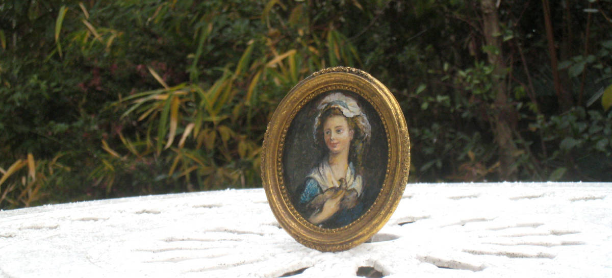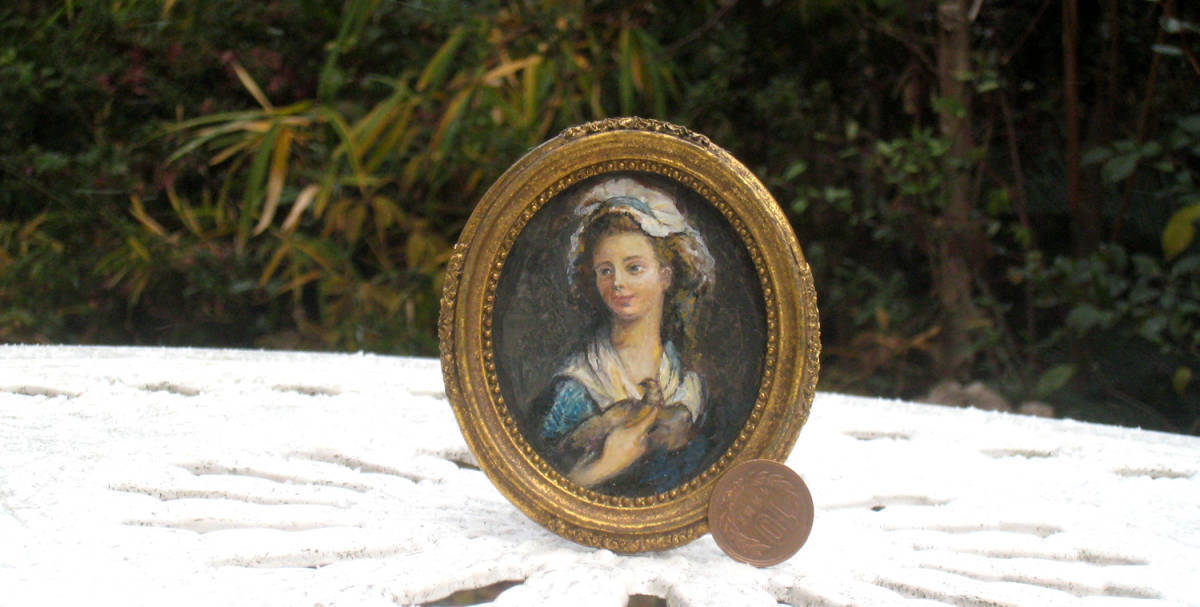 8年ほど前、友人にドールハウス用のリアルな古典絵画の額縁が販売されている。と、いう話を聞きました。まだ日本ではこの額縁で古典絵画のミニサイズの絵を描いている人がいないので描いてみては?と、いうお誘いがありました。さっそく紹介された店に行くと、本当に素晴らしい額縁でした。早速、厚紙に面相筆で練習をし始めました。偶然、随分前からフェイスブックにCGの作品をアップロードしていましたので、そこになんの説明もなくこのミニ絵画をアップロードしました。広く、海外のアートの好きな人が集まるグループです。すると意外と、様々な外国語で夥しい“いいね“と、共感するというメッセージをいただきました。