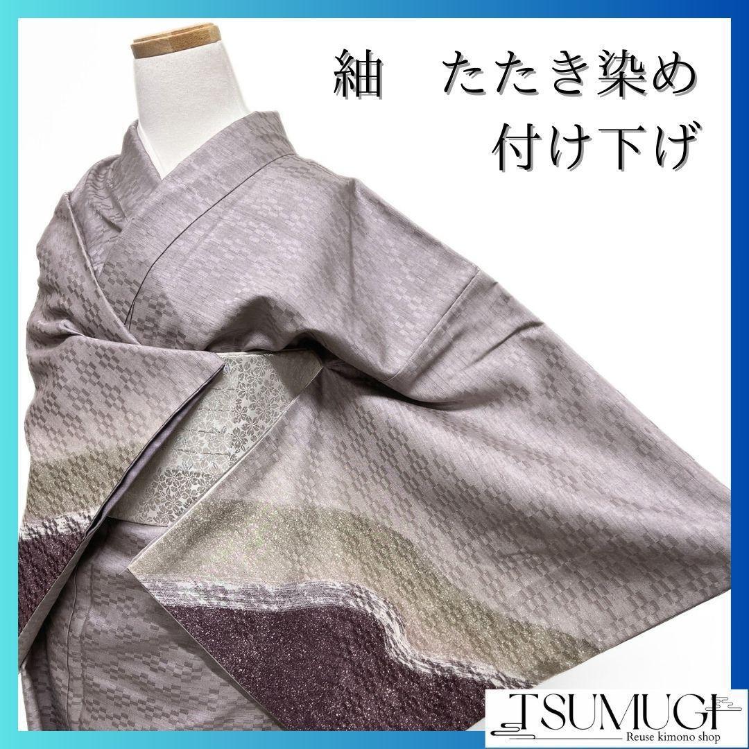 紬地 たたき染め 流線 付け下げ 着物 024a p