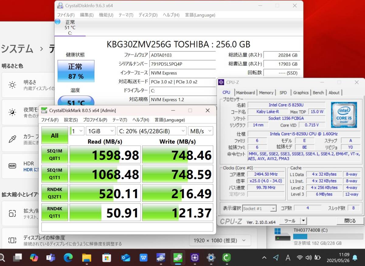 CPU: 超高速 Intel 高性能 八世代Core i5-8250u 1.6Ghz、 4コア8スレッド (ターボ・ブースト利用時の最大周波数 3.4GHz) |