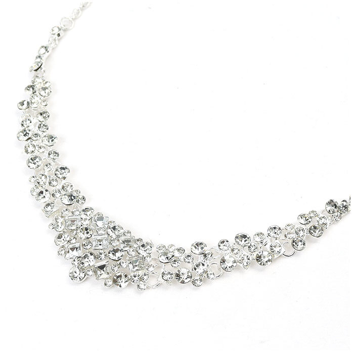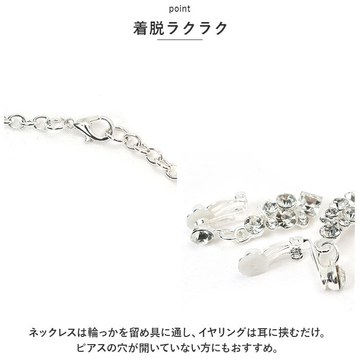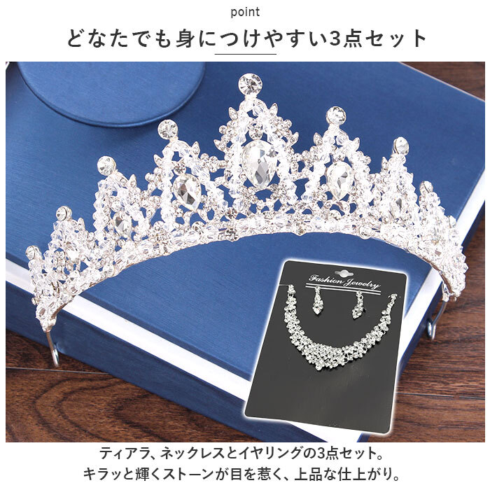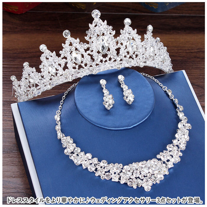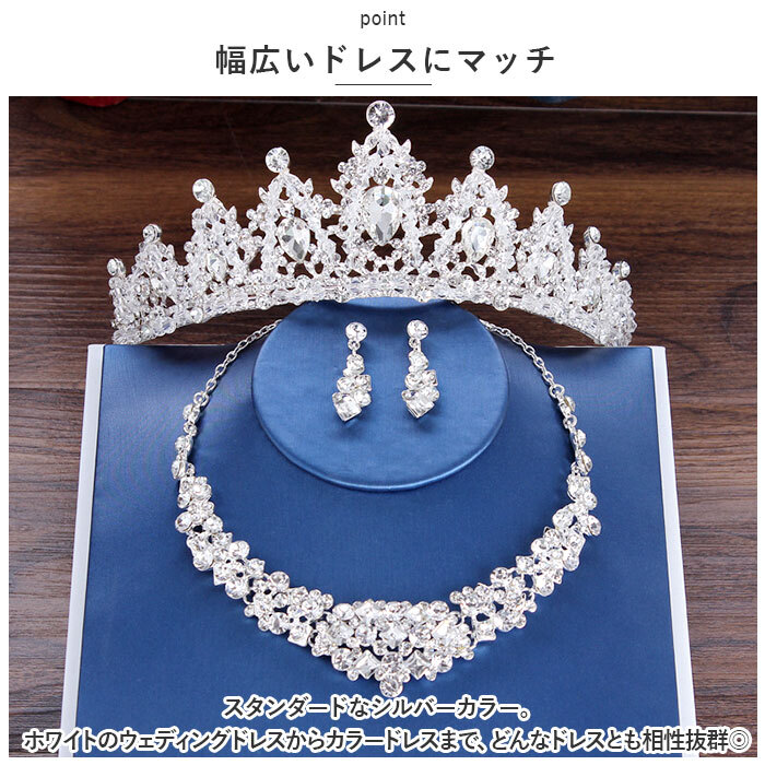 商品説明 | ・・ドレススタイルをより華やかに♪ウェディングアクセサリー3点セットが登場。 ・【どなたでも身につけやすい3点セット】 ・ティアラ、ネックレスとイヤリングの3点セット。キラッと輝くストーンが目を惹く、上品な仕上がり。 ・【着脱ラクラク】 ・ネックレスは輪っかを留め具に通し、イヤリングは耳に挟むだけ。ピアスの穴が開いていない方にもおすすめ。 ・【幅広いドレスにマッチ】 ・スタンダードなシルバーカラー。ホワイトのウェディングドレスからカラードレスまで、どんなドレスとも相性抜群◎ |