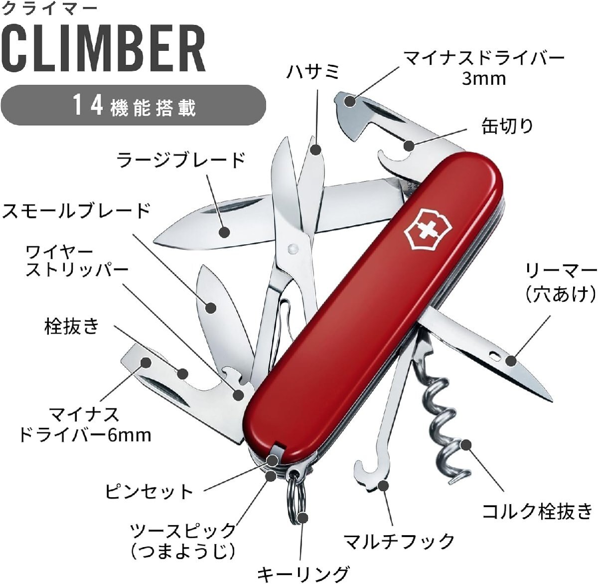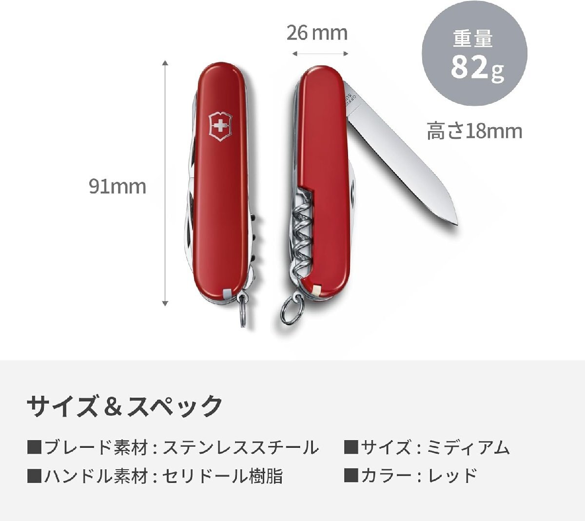 ・機能数:15機能/ラージブレード(大刃)・スモールブレード(小刃)・コルクせん抜き・カン切り・マイナスドライバー(小)3mm・せん抜き・マイナスドライバー(大)6mm・ワイヤーストリッパー・リーマー(穴あけ)・キーリング・ピンセット(毛抜き)・ツースピック・はさみ・マルチフック・ソーイングアイ(糸穴)