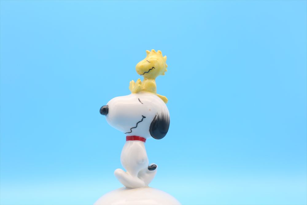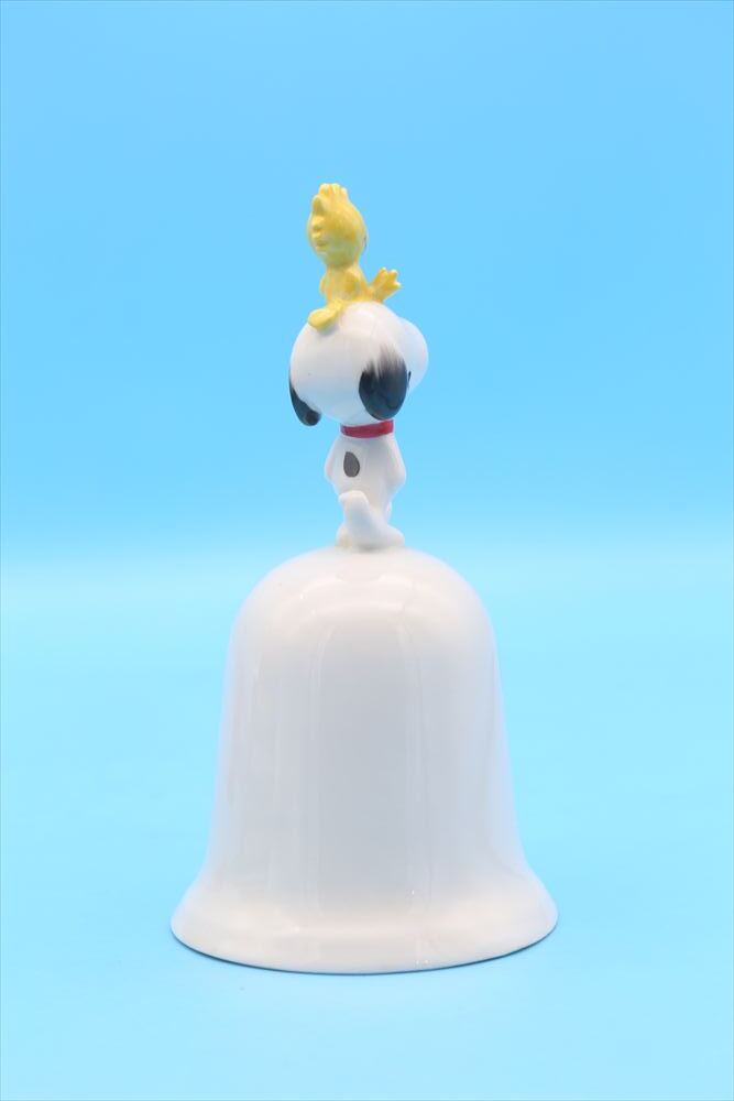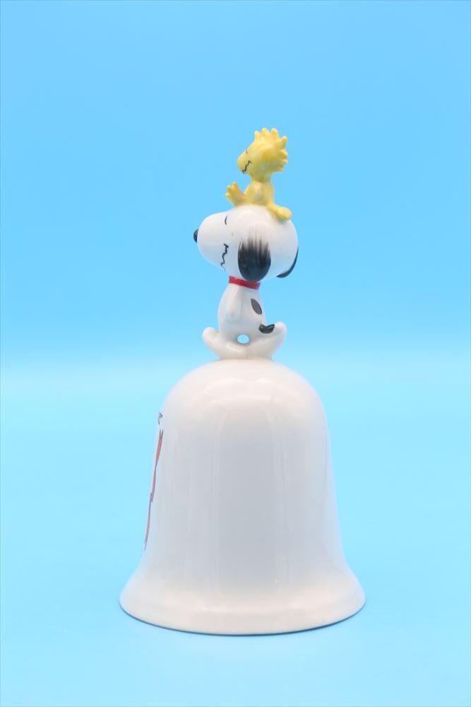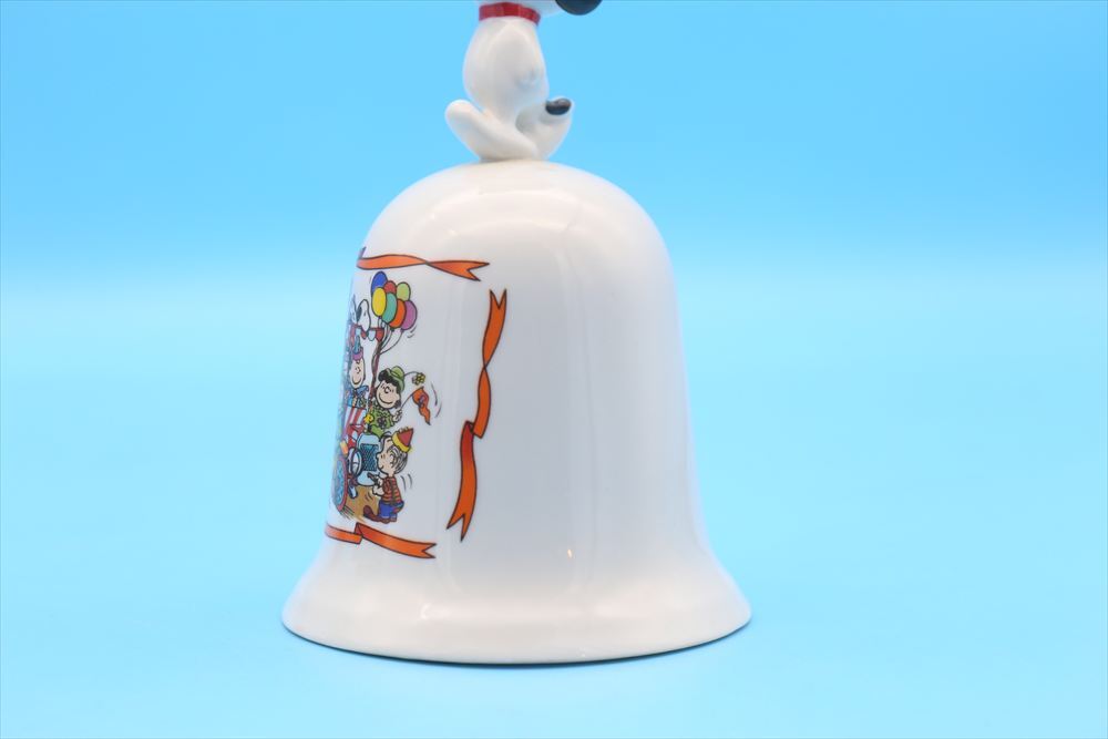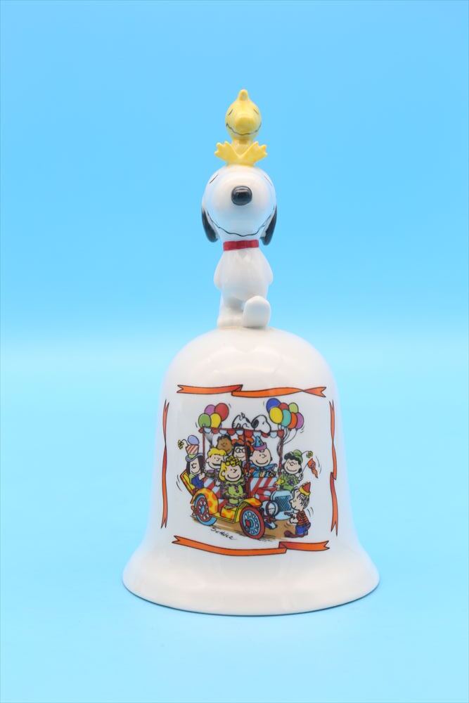 スヌーピーとウッドストックがトップにちょこんと乗った、愛らしい陶器製ベル。 1985年にSchmid社からリリースされた「Clown Capers」シリーズの一つで、ピーナッツギャングがクラウンパーティカーに乗り込んだ賑やかで楽しいデザインが特徴です。 カラフルなバルーンやパーティ帽をかぶったキャラクターたちの姿が、側面に鮮やかに描かれています。スヌーピー&ウッドストックの立体的なフィギュアが上部に付いた、見た目にも楽しいアイテムです。