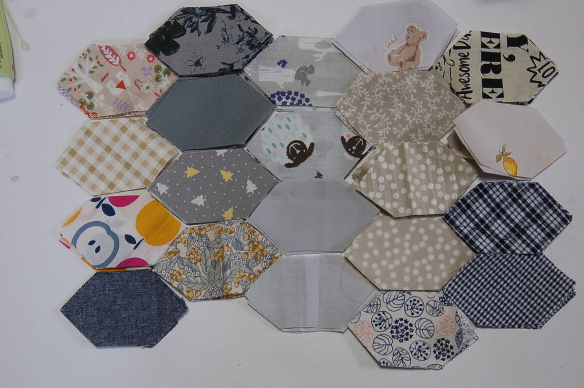 パッチワーク用細長六角形出来上がりサイズ22㎜に裁断してます。