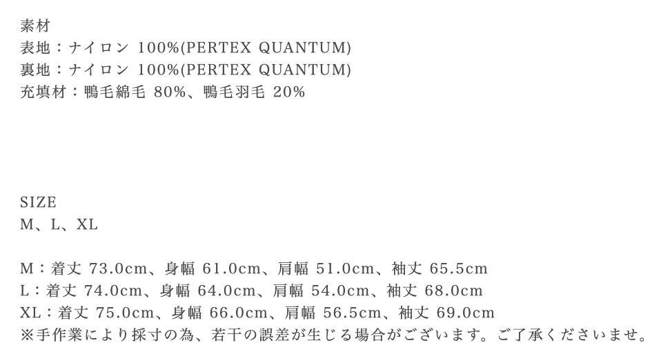 細かなリップストップ生地なので、耐久性も高い一枚、後加工無しでもダウンが抜け出さず快適な着心地を楽しんでいただけます。