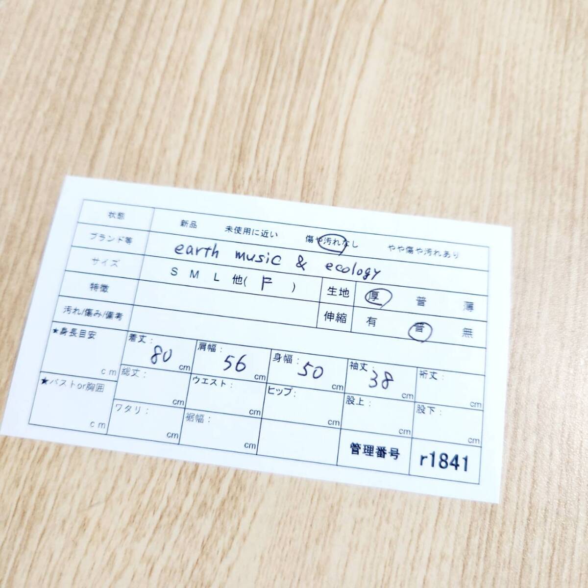 表記サイズF。着丈80、肩幅56、身幅50、袖丈38cmで、ゆったりめのM~L相当のサイズ感です。