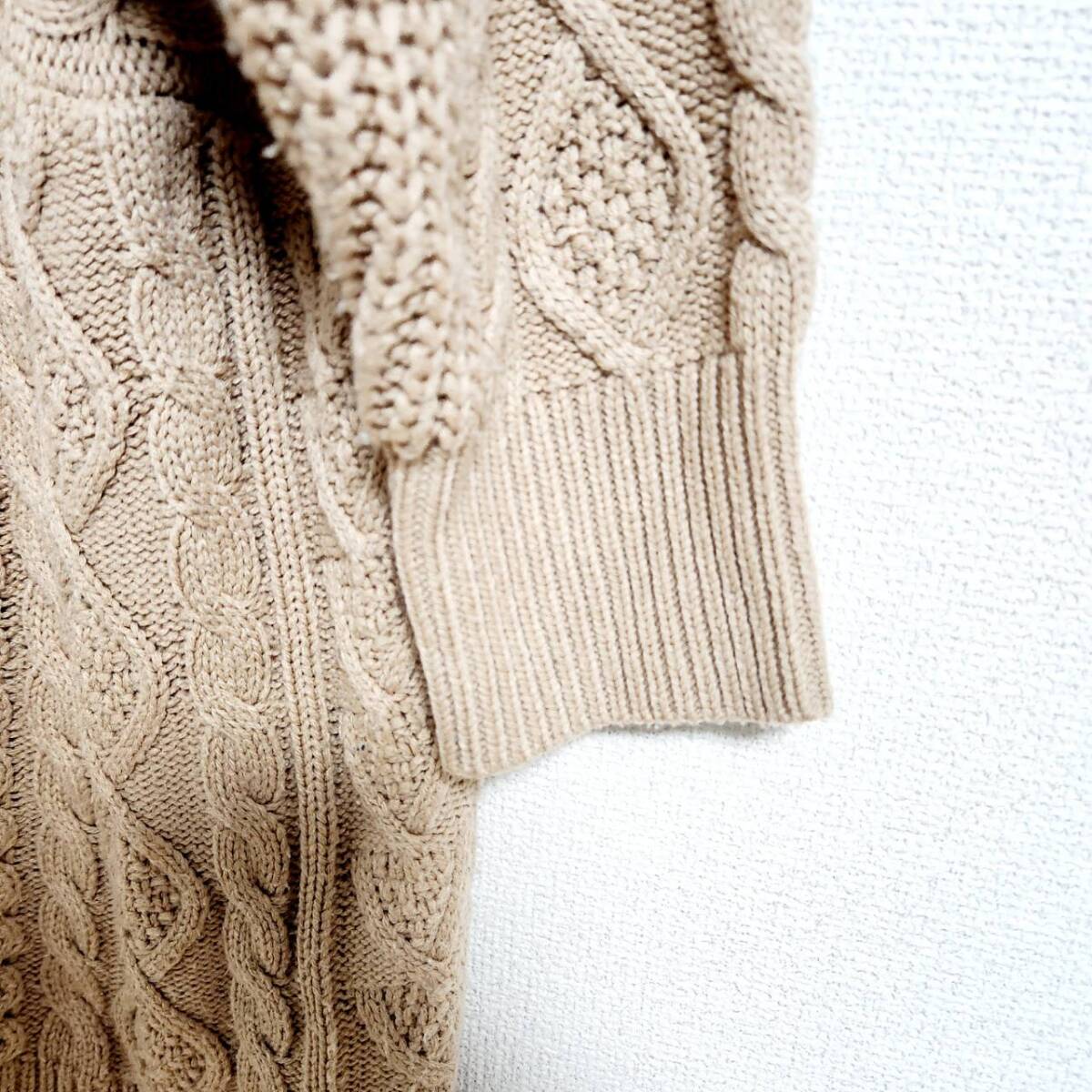 フロント全体にあしらわれたケーブル模様が立体感を演出し、ナチュラルであたたかみのある雰囲気に仕上がっています。ゆったりとしたオーバーサイズシルエットで、リラックス感も◎