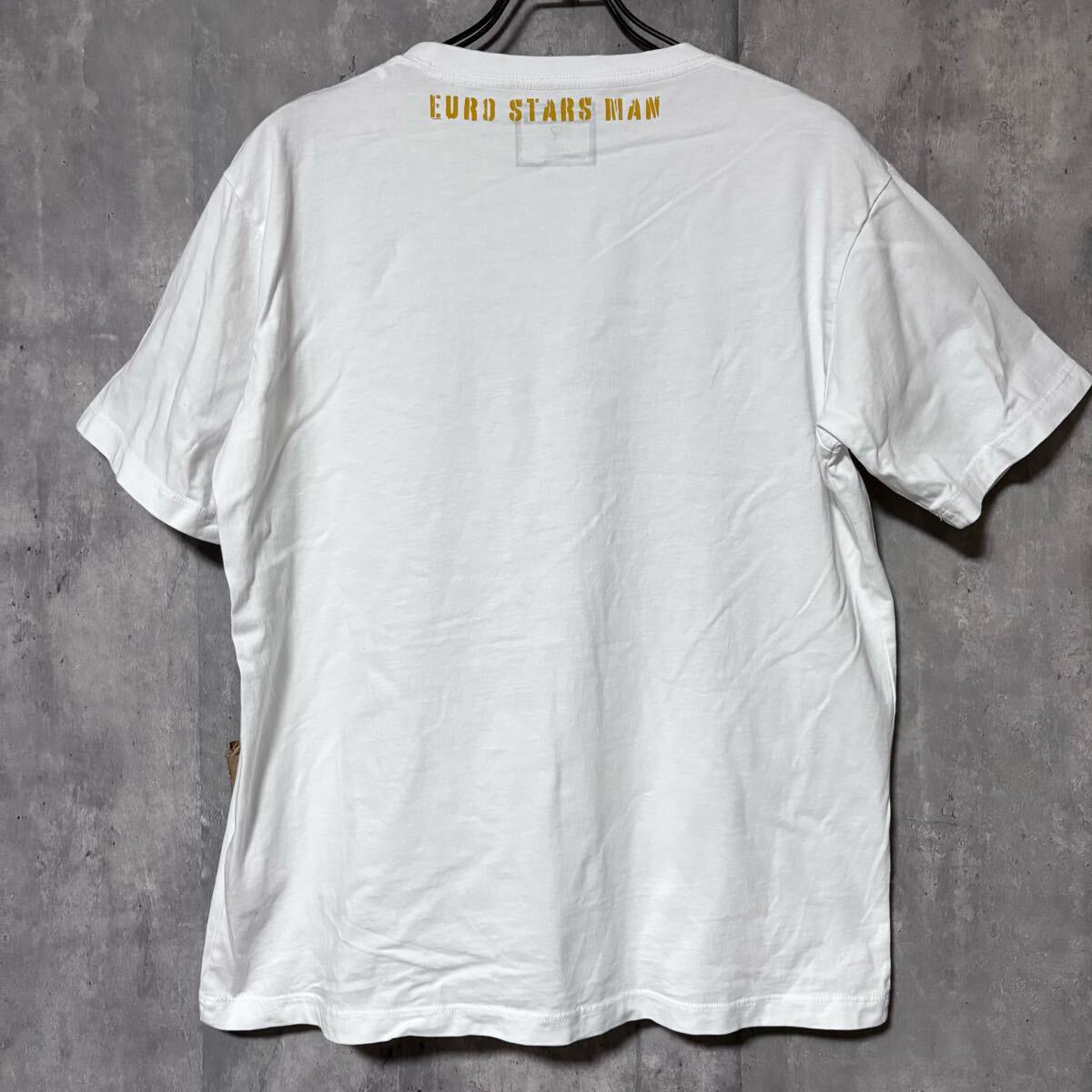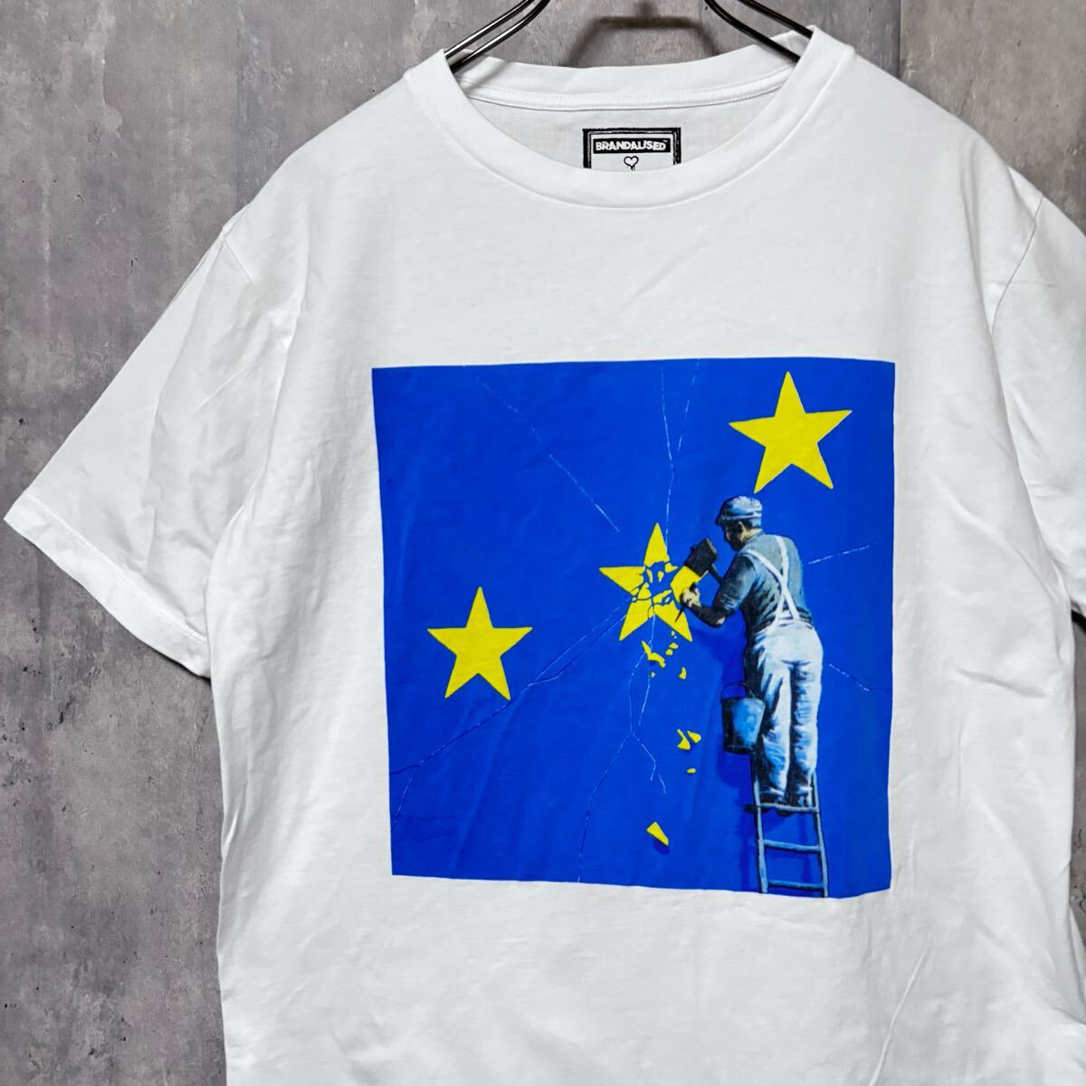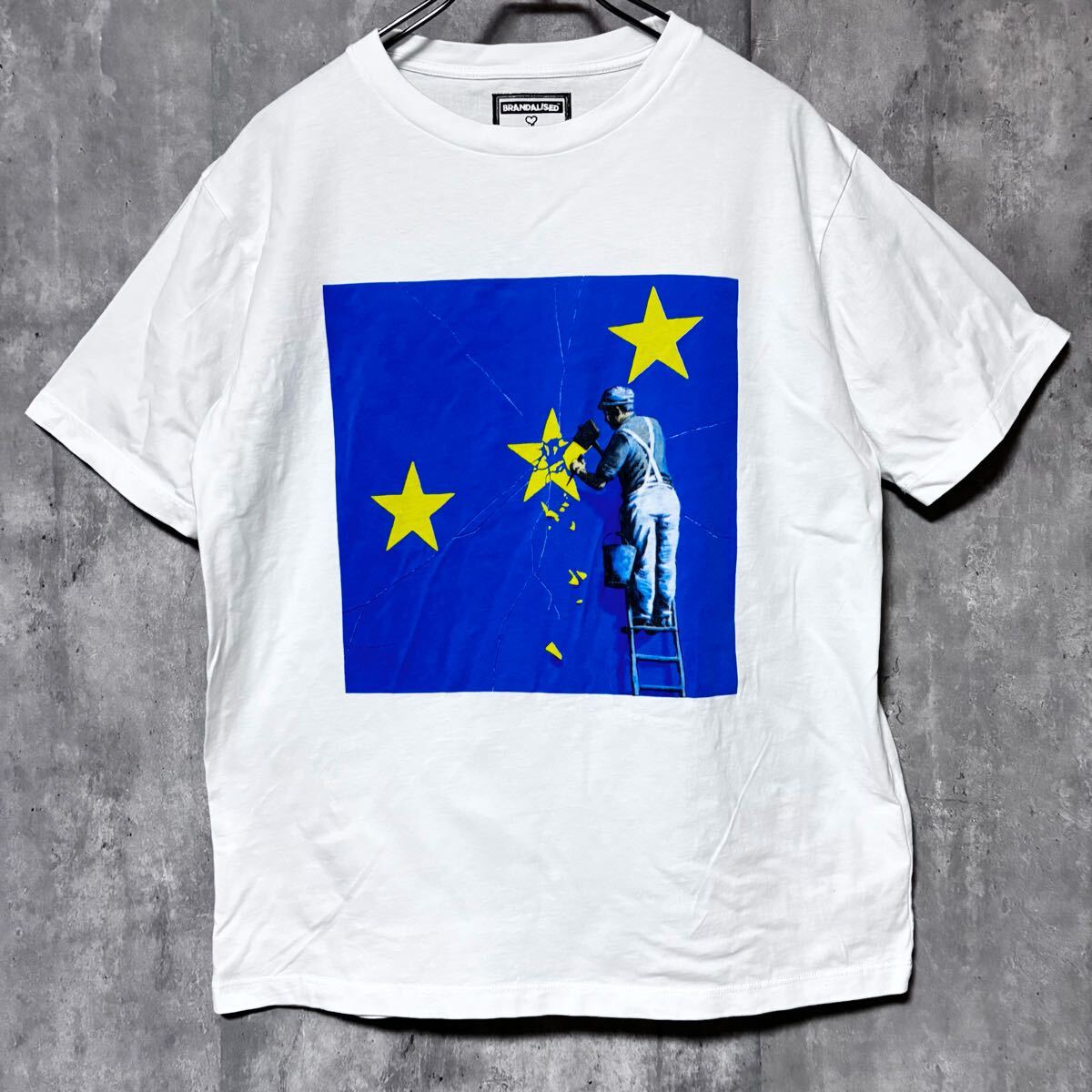 青と黄色のコントラストが際立つ、作業員のアートプリントTシャツ。