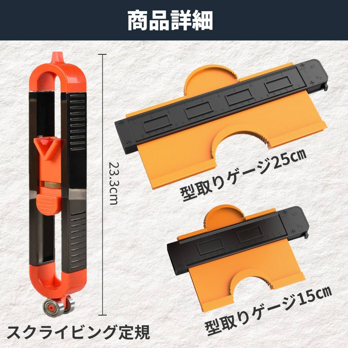 この型取りゲージとスクライバーのセットは、プロファイルゲージや輪郭ゲージとして使用可能です。DIY工具や木工ツールとして、正確な形状コピーを実現します。連結機能付きで、必要に応じて長さを調整可能。建築工具としても、高精度の形状トレースが可能で、ロック付きで測定した形状を保持します。大工道具として、製図やマーキングに最適な便利ツールです。