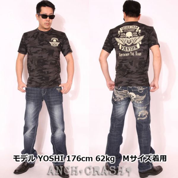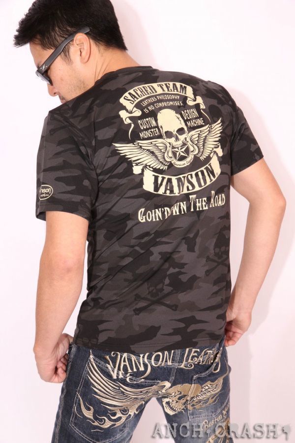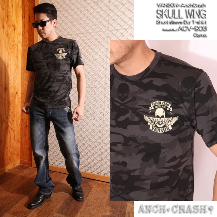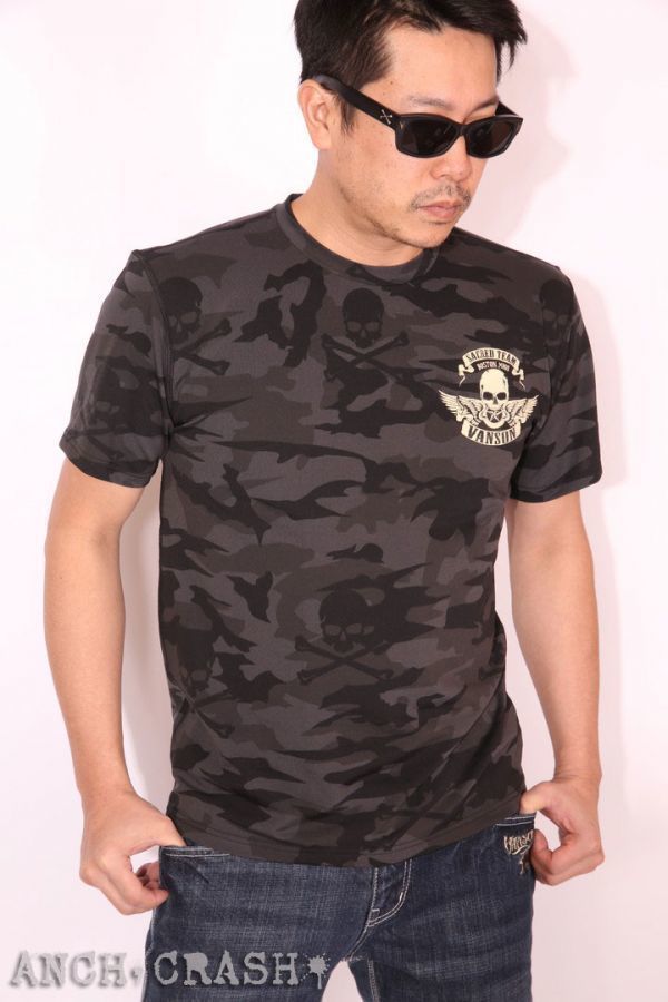 VANSON ドライ 半袖Tシャツ スカルウィング 吸汗速乾 抗菌防臭 UVカット カモフラ【M】 当店別注 バンソン ACV-903 迷彩 総柄 男女兼用