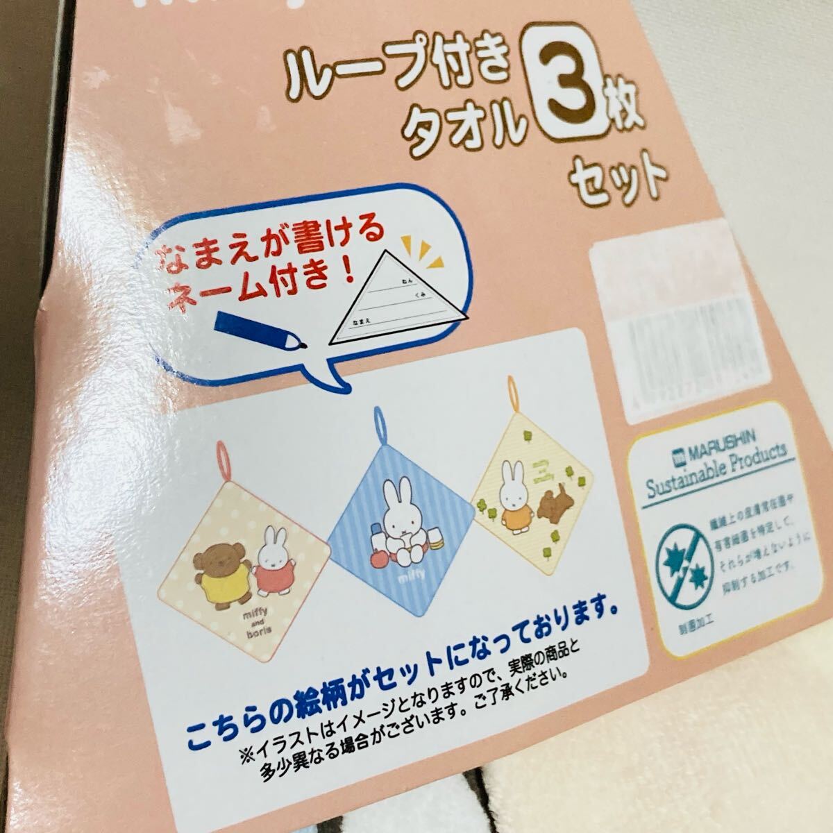 ミッフィーのデザインが施されたループ付きタオル3枚セット。