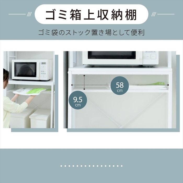 | 収納したいゴミ箱の数に合わせて選ぶことができるゴミ箱上収納ラック。 キッチンのスペースを無駄なく有効活用できるゴミ箱上ラック。 収納だけでなく、作業台としてもお使いいただけるので、キッチン収納の強い味方。 幅63cmでゴミ箱も2つ収納できるスペースがあります。 |