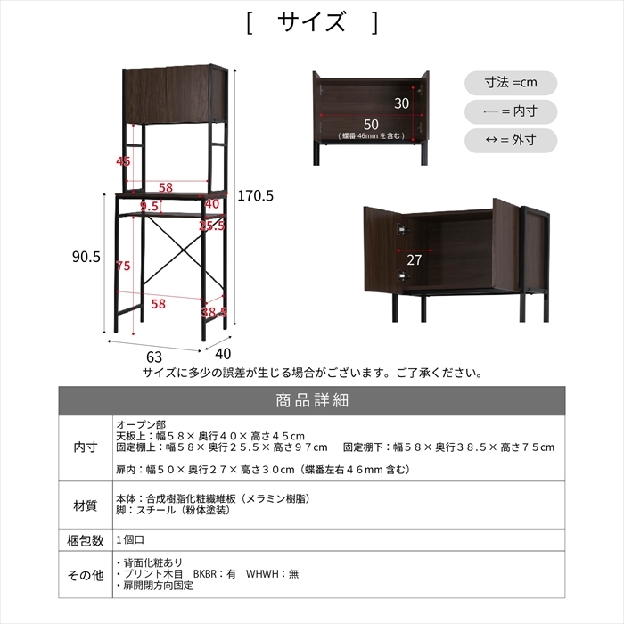 | [内寸] (天板上)幅58×奥行40×高さ45cm (固定棚上)幅58×奥行25.5×高さ9.5cm (固定棚下)幅58×奥行38.5×75cm (扉内)幅50×奥行27×高さ30cm (作業面)幅58×奥行40×高さ90cm |