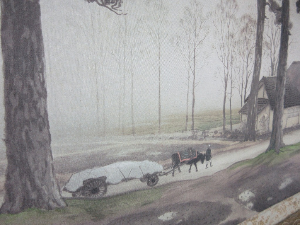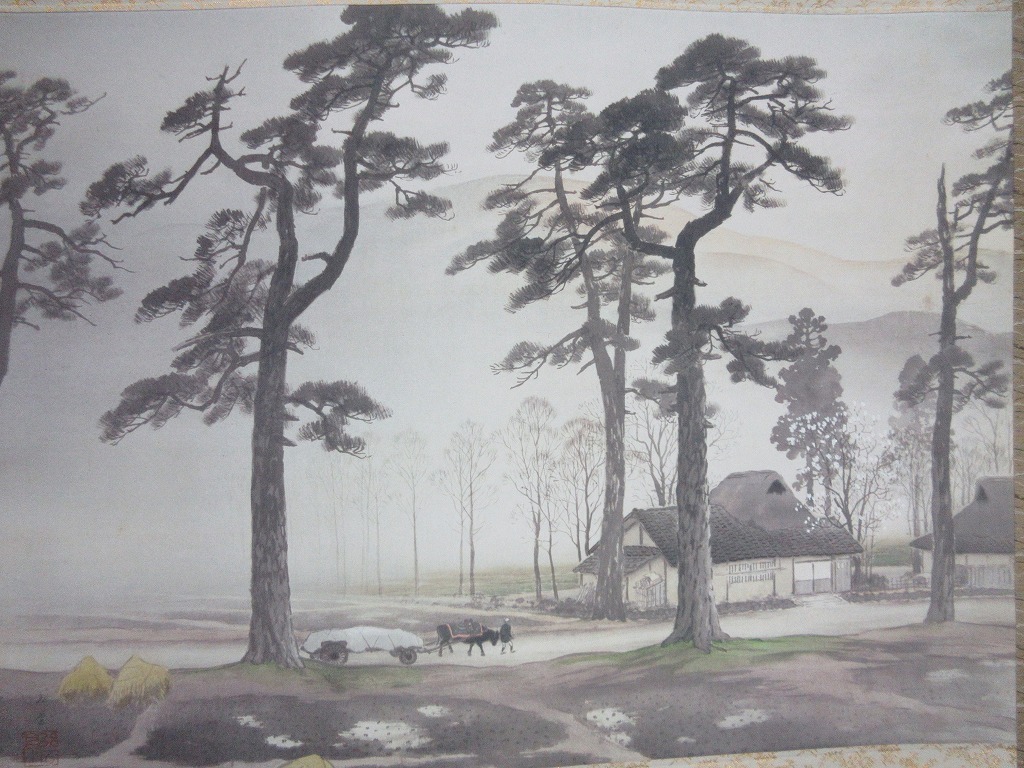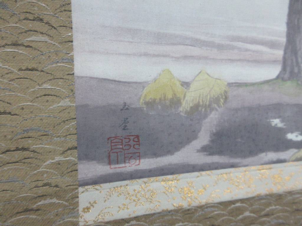 複製画 川合玉堂 【朝もや】 巧芸画 絹本 掛軸です。多少シミあります。あまり目立ちませんので、そのまま掛けられると思います。全体のサイズは約85㎝×約154㎝、画寸法は約68.5㎝×約50㎝です。