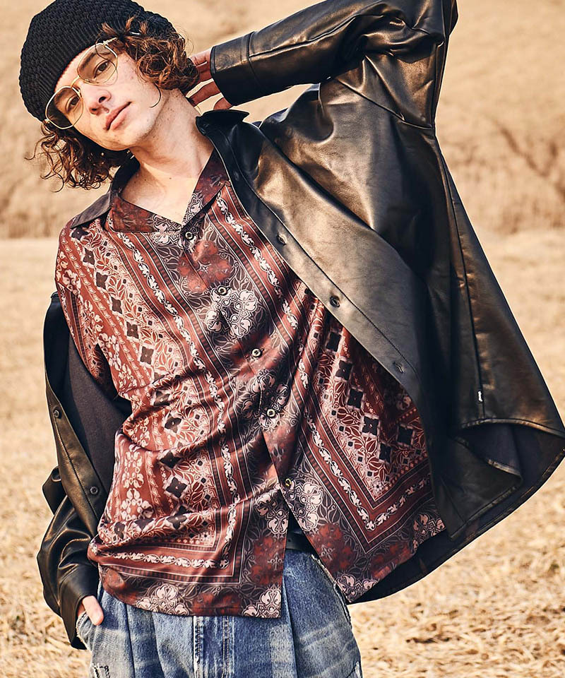 アダルトなレザーシャツを現代的な素材使いとシルエットメイキングでカジュアルに提案。テキスタイルには汚れに強く、伸縮性と軽さを兼ね備えた薄手のシンセティックレザーを使用。本革さながらの艶やシボの表情が魅力。サイジングはドロップショルダーに広めの身幅、長めの着丈を掛け合わせたビッグシルエット。ざっくりと羽織ったアウターライクな着こなしもおすすめ。