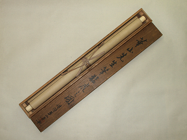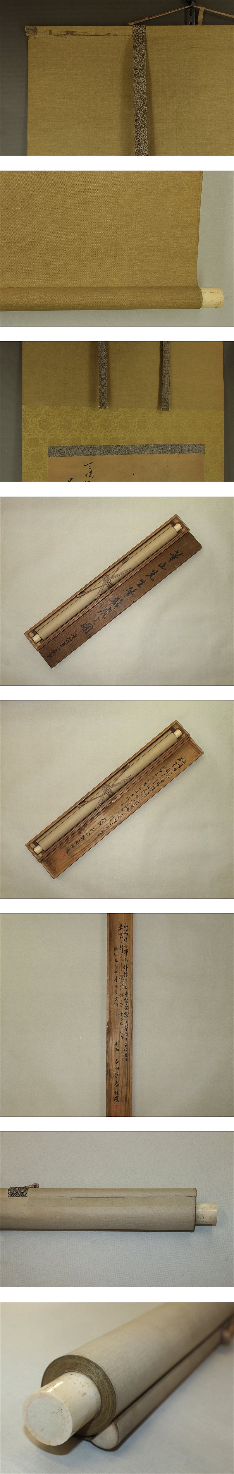 渡辺華山 わたなべ-かざん(1793-1841) 江戸後期の画家・思想家・三河田原藩士。江戸生。名は定静、通称は登、字は伯登・子安、 のち崋山、号に昨非居士・寓画堂・全楽堂等。家老として藩務に精励する傍ら蘭学に親しみ、 高野長英・小関三英らと尚歯会を結成。画は白川芝山・谷文晁に学び、 種々の画法を研究しながら風俗写生に才をみせ、洋画描法をも摂取して 特に肖像画に洞察の深さと筆鋒の鋭さを発揮した。 蛮社の獄に連坐した蟄居中、天保12年(1841)歿、49才。 本紙は、染み、汚れ、強い折れ、皺、虫食、擦れ、ヤケがあります。 表装は、染み、汚れ、折れ、皺、破れ、ほつれ、くすみ、修復痕、軸先に汚れと傷みがあります。 【サイズ】 作品 横約51cm×縦約128.5cm 表装 横約65cm×縦約198cm |