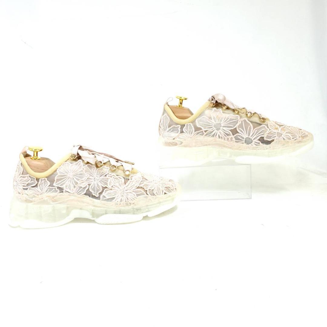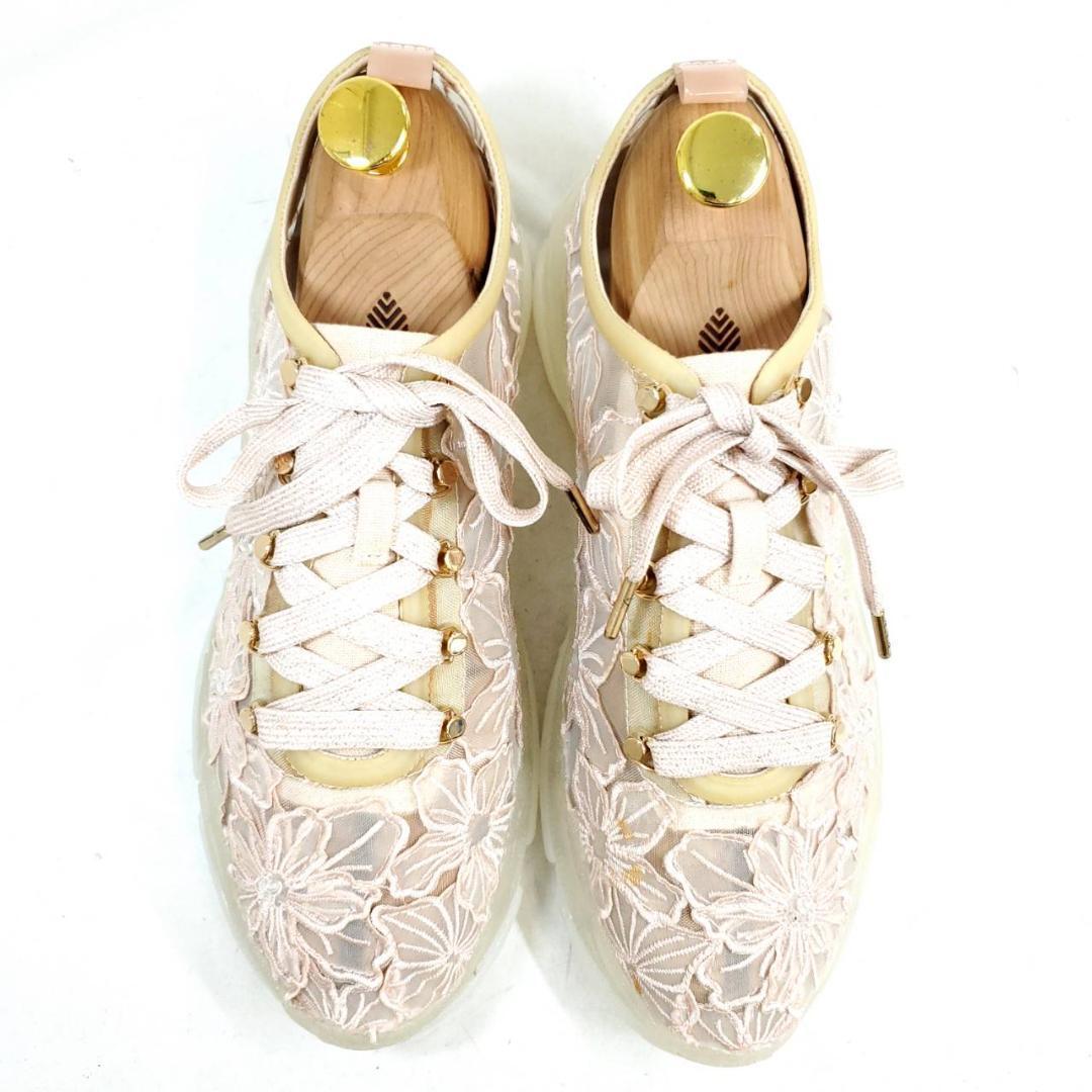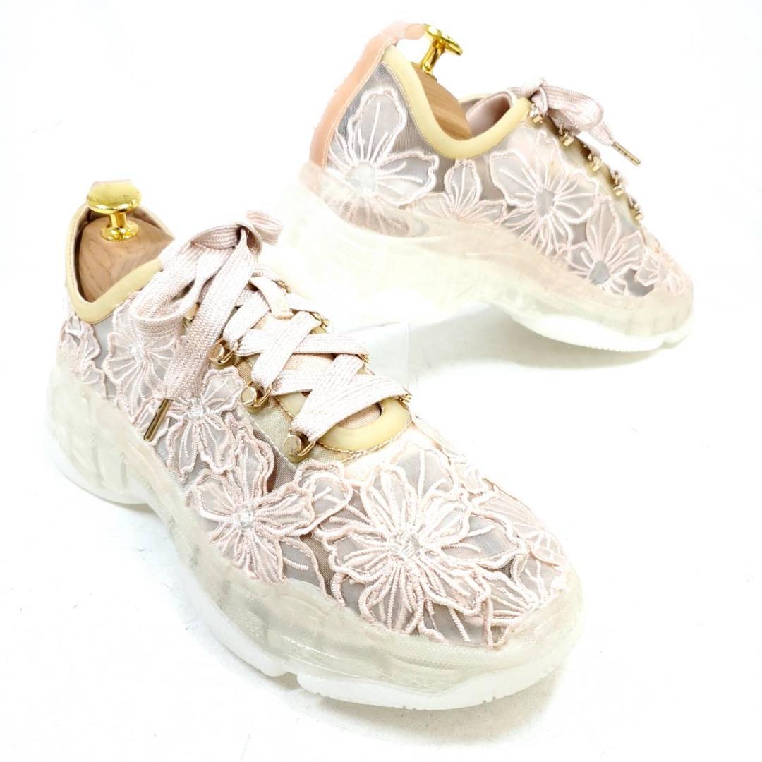 繊細なフラワーレース刺繍が、アッパー全体に施されています。淡いピンク系のカラーに、ゴールドのパーツがさりげない高級感をプラス。