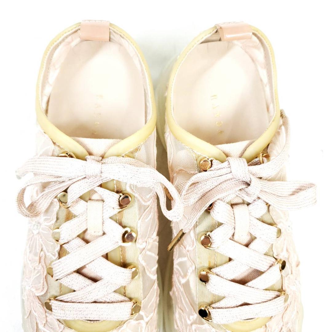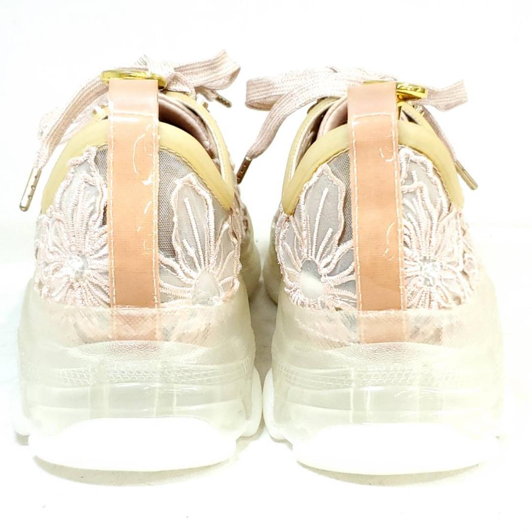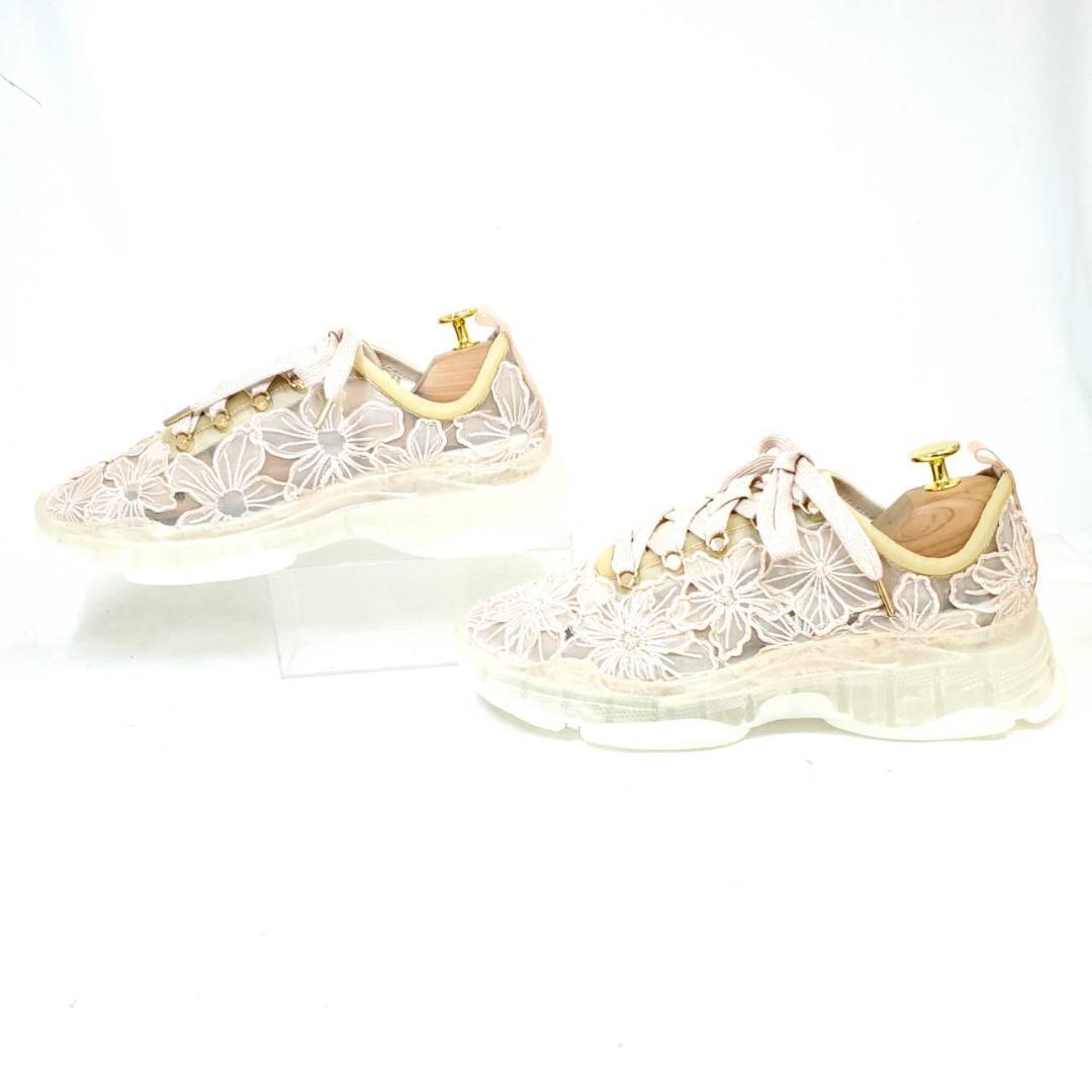 繊細なフラワーレース刺繍が、アッパー全体に施されています。淡いピンク系のカラーに、ゴールドのパーツがさりげない高級感をプラス。