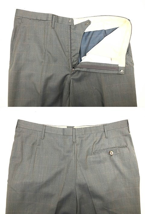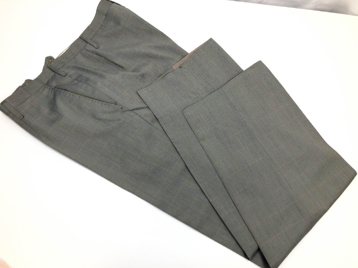 ・スラックス・・・ウエスト実寸約84センチ(2センチ出し、4センチ詰め可能)、股上約28センチ、渡り幅約33センチ、股下約73センチ、総丈約99センチ、裾幅約23.5センチ、シングル仕上げ(最大でプラス5センチ長くできます)