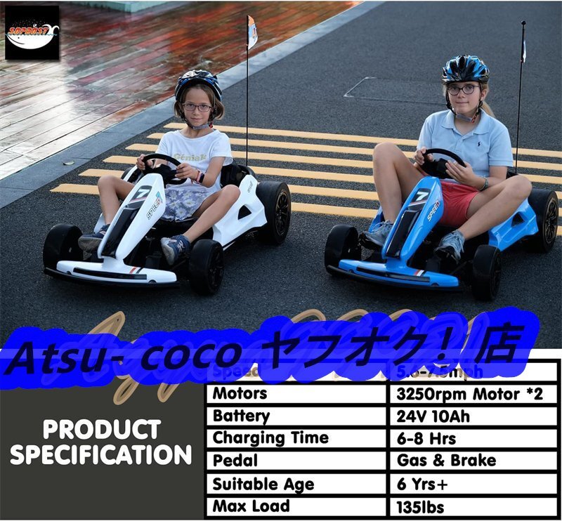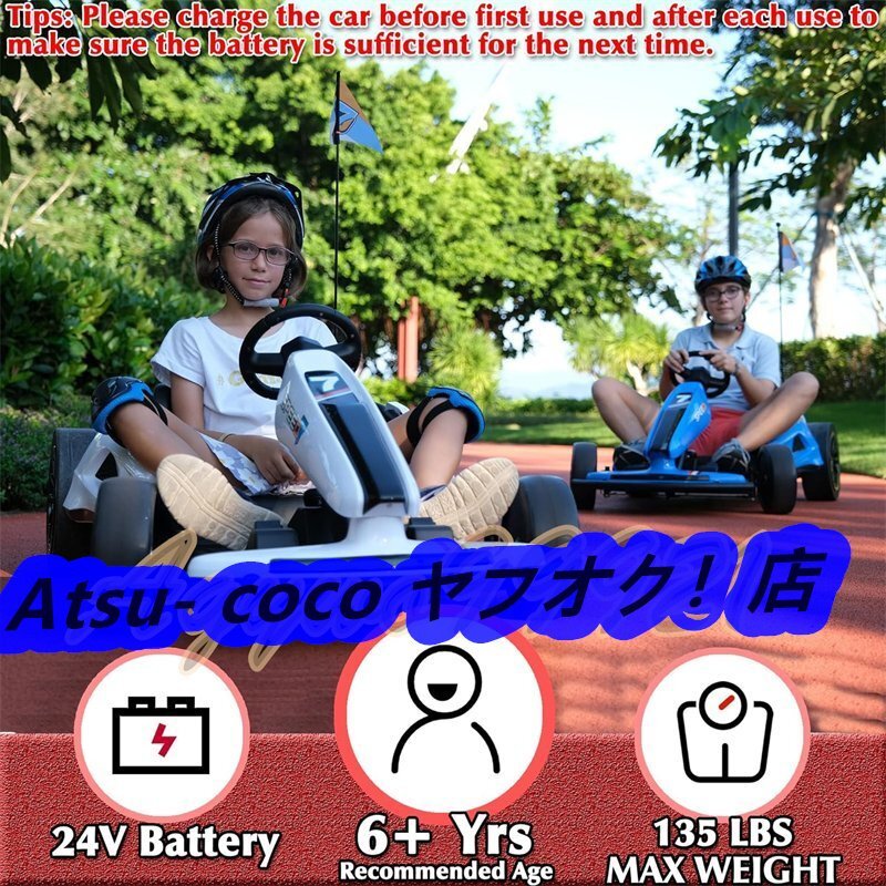 【24V電動ゴーカート】この子供用車には、強力な24V 10Ah充電式バッテリー、2つの速度 (5.6-7.5mph)、2つの運転モード (通常運転とドリフト運転)、さまざまなレベルのドライバーに適しています。