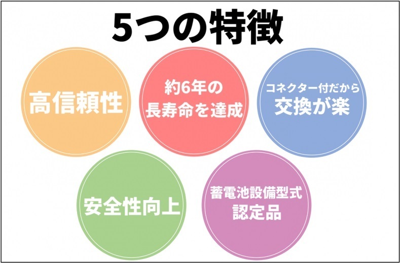 ●安全性向上(極板の伸びに対する電槽内スペースを確保し電槽破壊年数を延長、難燃樹脂を採用、UL認定品)