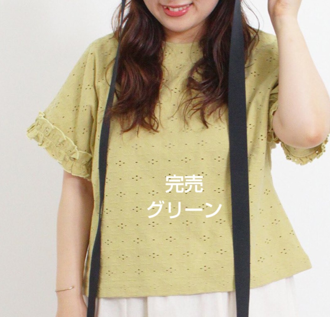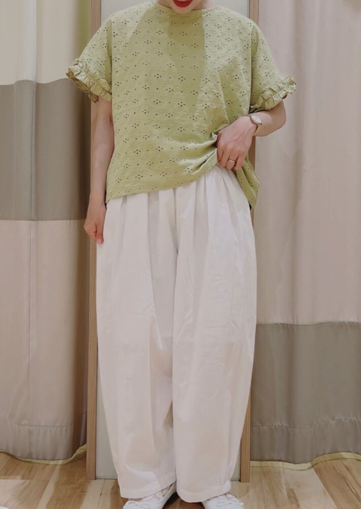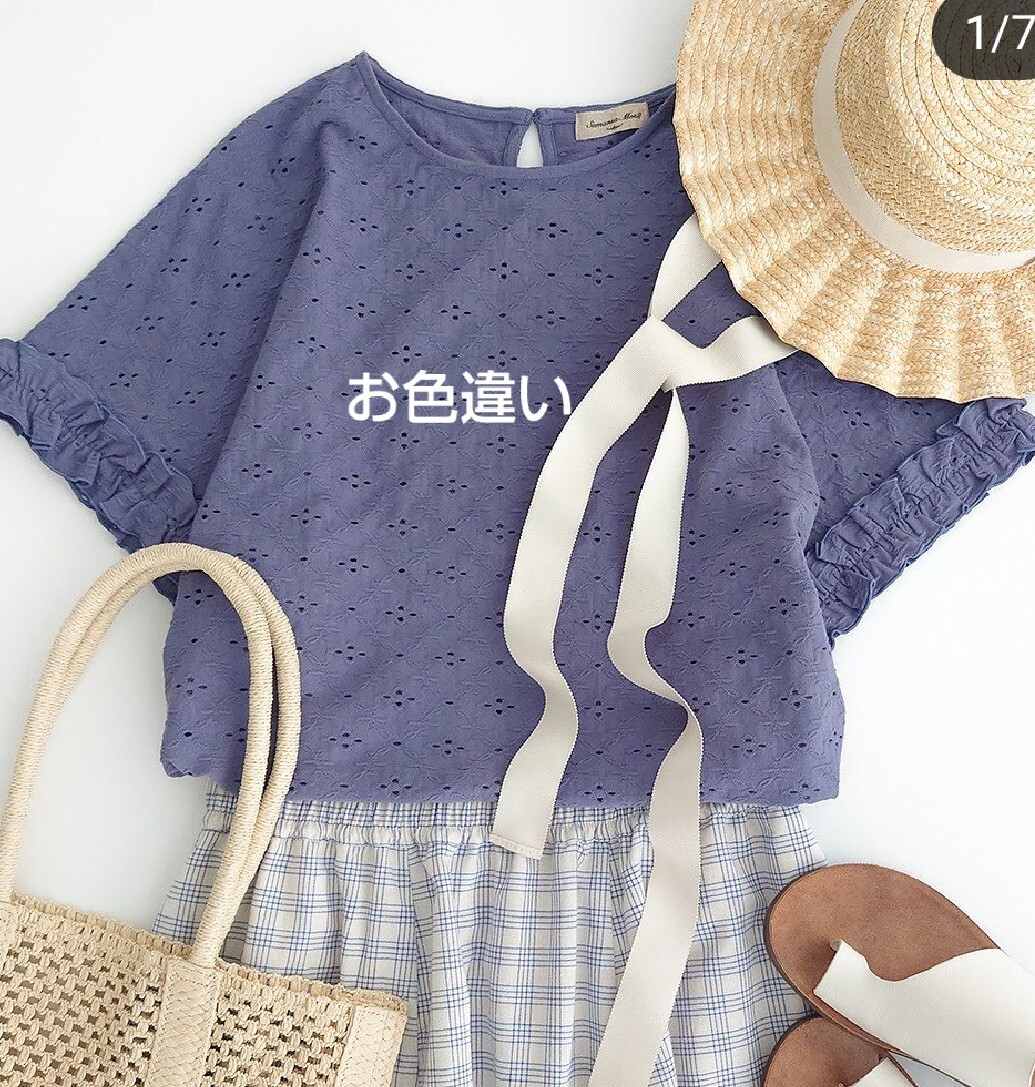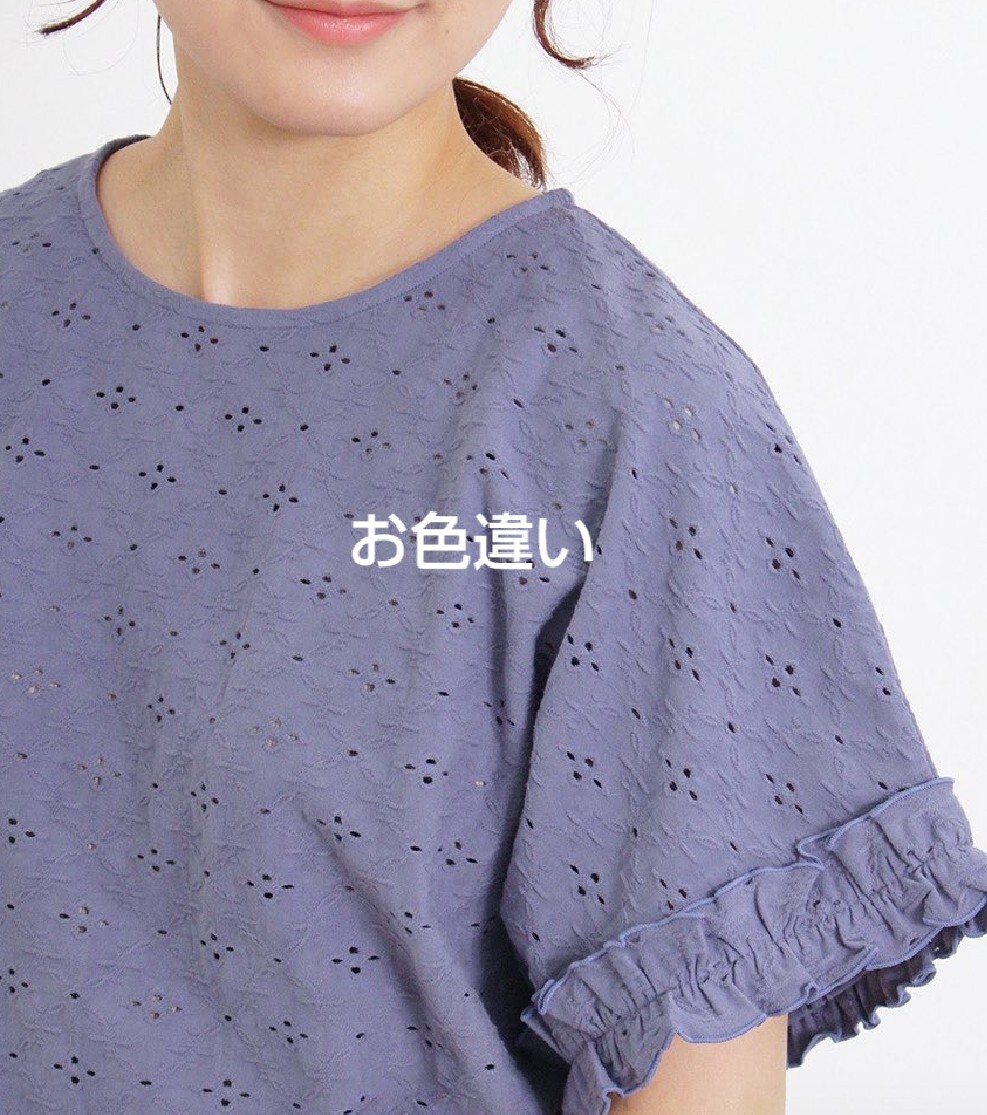 壁紙のような柄がかわいい オリジナルのデザインのアイレット素材を使用しました。 袖口に付いた共布フリルが腕をすっきり見せてくれます。 ゆったりとしたシルエットでリラックスして着られるアイテムです。
