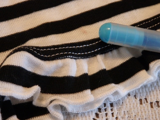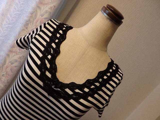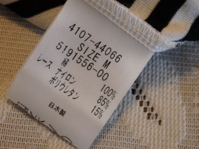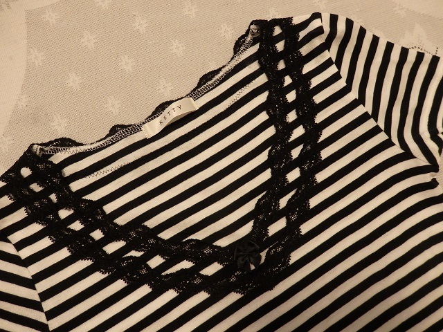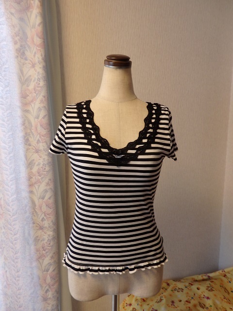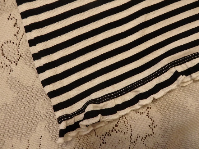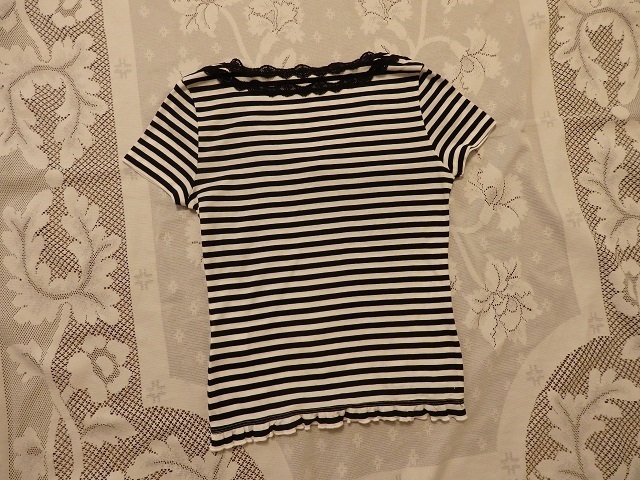 ・サイズ:M ・素材:綿100% レース~ナイロン85% ポリウレタン15% ・平置実寸:身幅38.5(脇の下) 肩幅35 袖丈14.5 着丈50 <素人採寸ですので多少の誤差はお許し下さい> ・USEDー美品。1回の着用です ・めだった汚れシミは無い様に思いますが裾に1つテンの汚れがあります。気にならない程度だと思います ・黒×白のボーダー柄になります ・ネック部分、黒のレースと小さいリボンが付いてアクセントになっています ・裾は細いゴムが入ってフリルの様な感じです ・ゆるやかなVネックになります ・お洗濯OKです **汚れ、シミなど出来る限りチェックしておりますが、万一見落とし等ございましたらお許し下さい** |