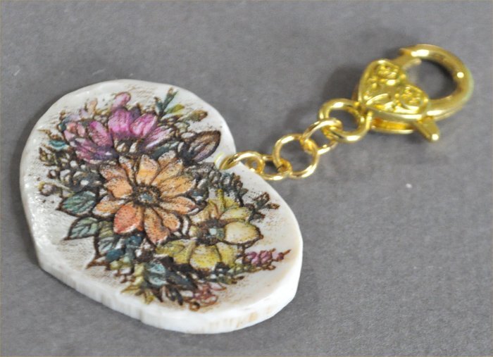 レーザー彫で花束を彫り彩色し他キーホルダーNO2素材マンモス牙レーザー彫で花束を彫り彩色したキーホルダーです。バスケットに下げると素敵です。