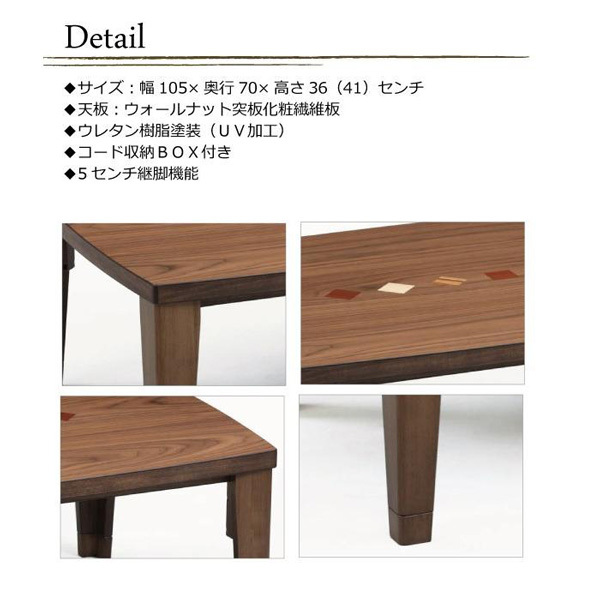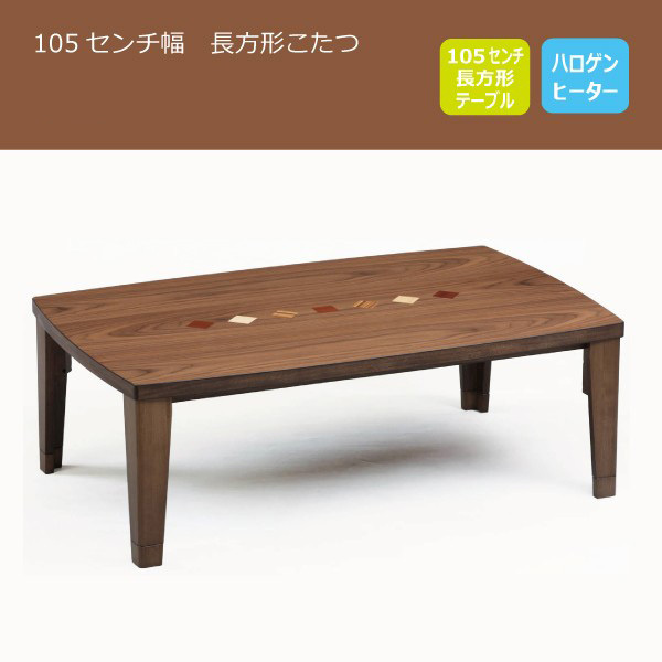 テーブル/こたつ モダンこたつ BITA-105 長方形105幅 ※お洒落なモダンタイプこたつです。人気のウォールナット突板☆天板の模様が個性的でお洒落です。5センチの継脚付きで、お好きな高さに調節できます。寒い冬は天板と本体の間に布団をはさんで炬燵として、春夏秋はモダンなセンターテーブル、リビングテーブルとして、一年中お使いいただけます。薄型ヒーターですので外からはヒーターは見えません。◆サイズ:幅105×奥行70×高さ36(41)センチ◆天板:ウォールナット突板化粧繊維板◆ウレタン樹脂塗装(UV加工)◆コード収納BOX付き◆5センチ継脚機能◆600w石英管ヒーター(中間入り切りスイッチ)☆KJU-600FCU◇このシリーズには「正方形80幅」「長方形105幅」「長方形120幅」の3サイズがございます。《1日~2日(土日除く)での発送となります》☆落札、ご入金確認後 1~2日にて発送いたします 追加納期のかかるものは商品ページに記載いたしております よろしくお願いいたします。