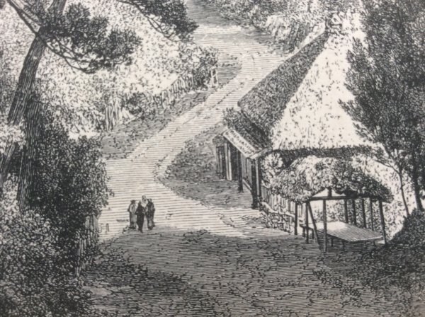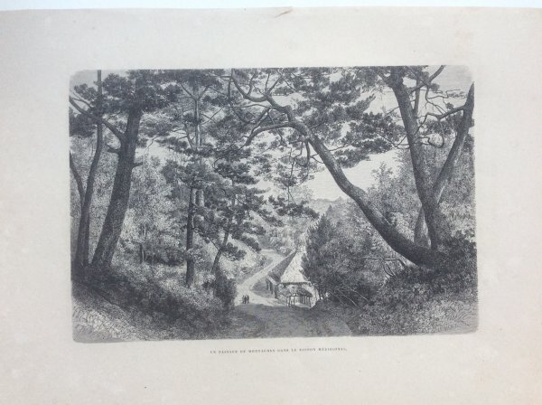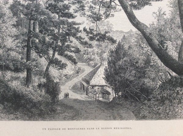 幕末1863年に、来日し、日本滞在中、当時の日本の風景や風俗習慣を記録し、帰国後1870年にパリのアシェット社から出版された稀覯本 幕末日本絵図に収められた木版画です。この版画は日本の南部の小道と題されていますが、幕末日本図絵を読むと京都 大阪より南の南紀地方の宗教的且つ精神的な役割を説明する中に出てくることから、南紀地方、熊野古道と思われます。