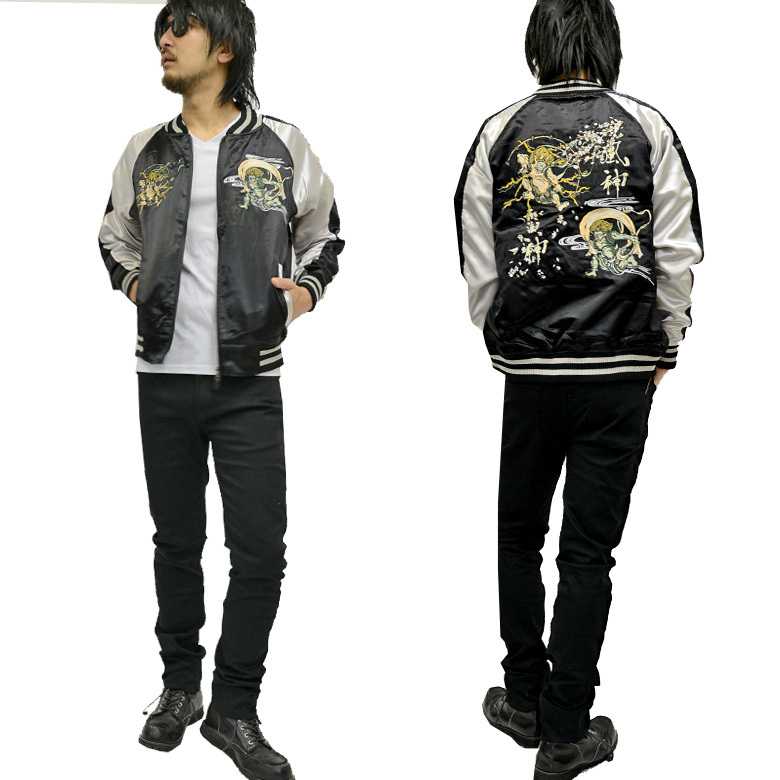 風神雷神 和柄刺繍 サテン スカジャン 本格 和柄刺繍 スカジャン 20-1481z FUUJIN RAIJIN 新品 ブラック L