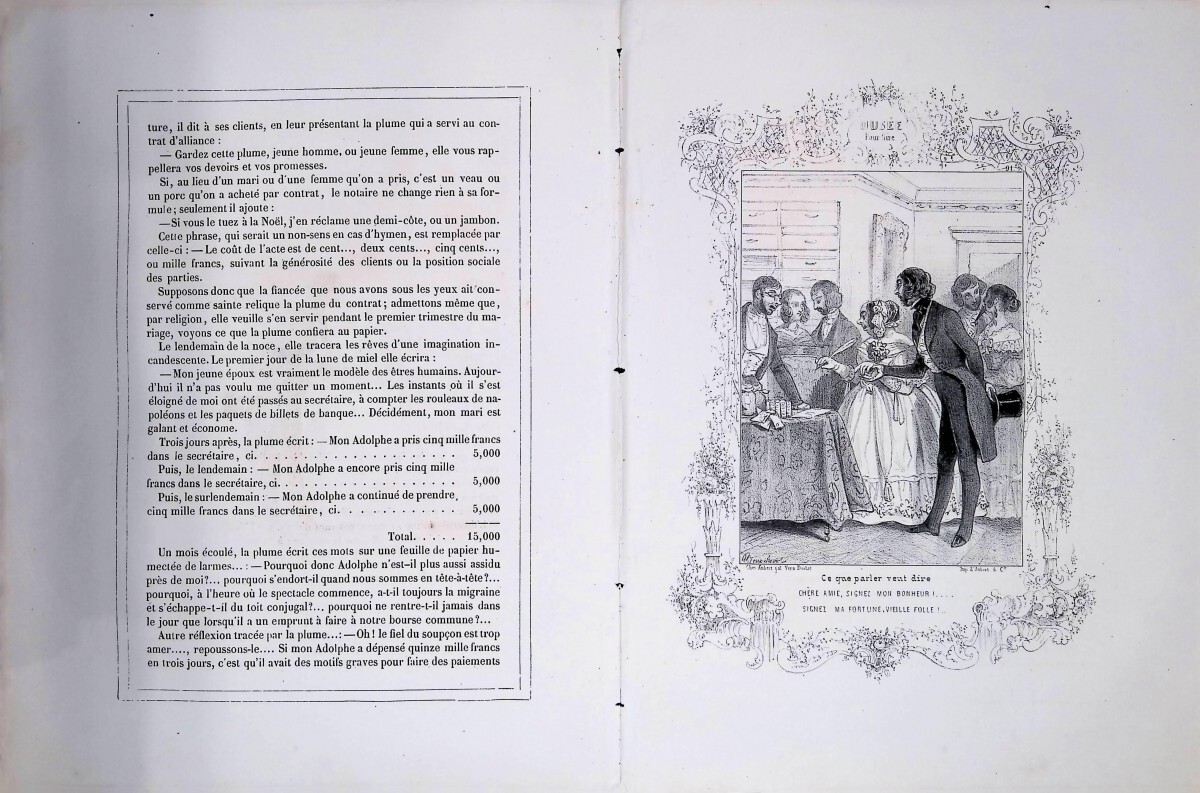 Honore Daumier の初期の作品を発表した石版画集 (Musee pour rire )に収められたオリジナル石版画です。 それぞれのタイトルの元で、3ページの解説と1ページの石版画の構成で シリーズになっています。サイズは、22cmx28cmです。4ページ2枚セットで3ページが石版画となっています。少し古色が出ていますが、状態は良いと思います。サインは、ありませんが、タイトルごとの解説テキスト著作者と石版画制作者のリストがありドーミエの石版画と確認できます。ご要望があればリストのコピーをお付けします。