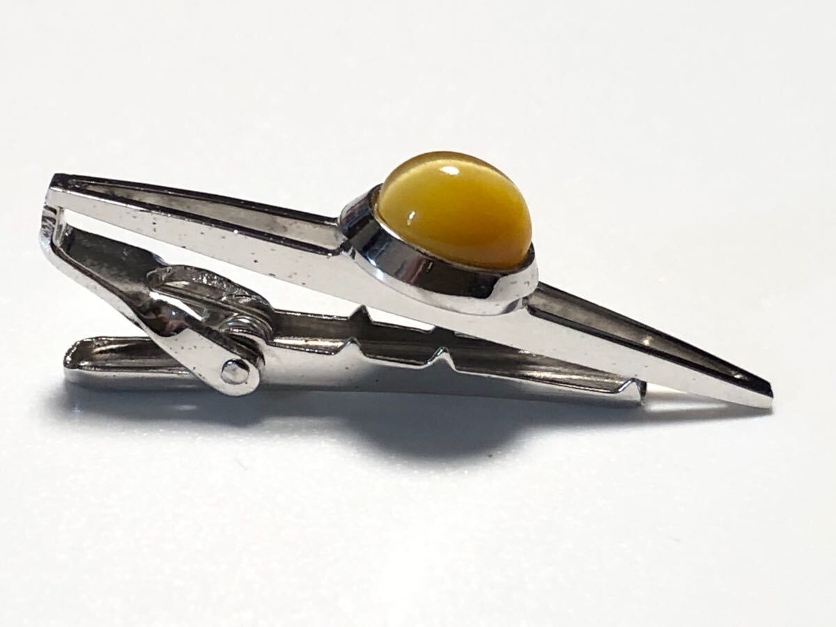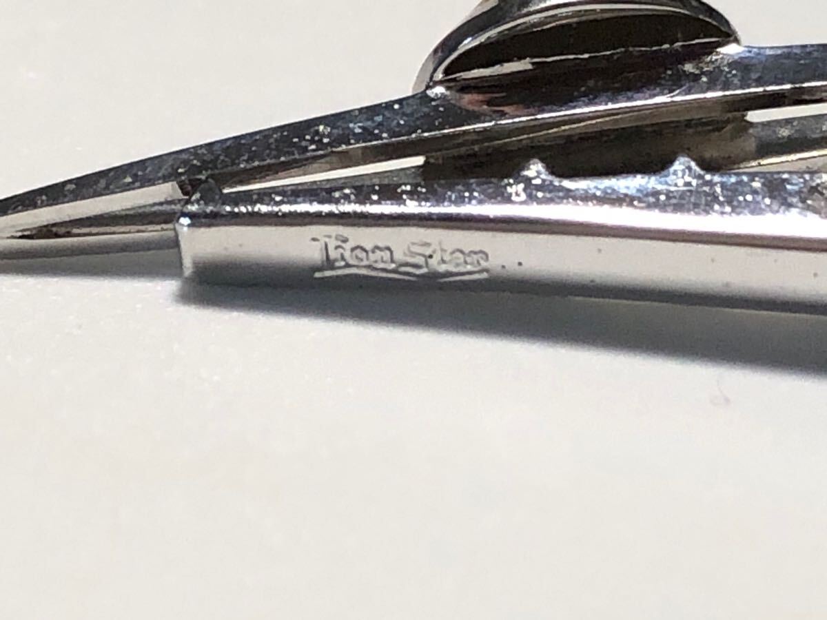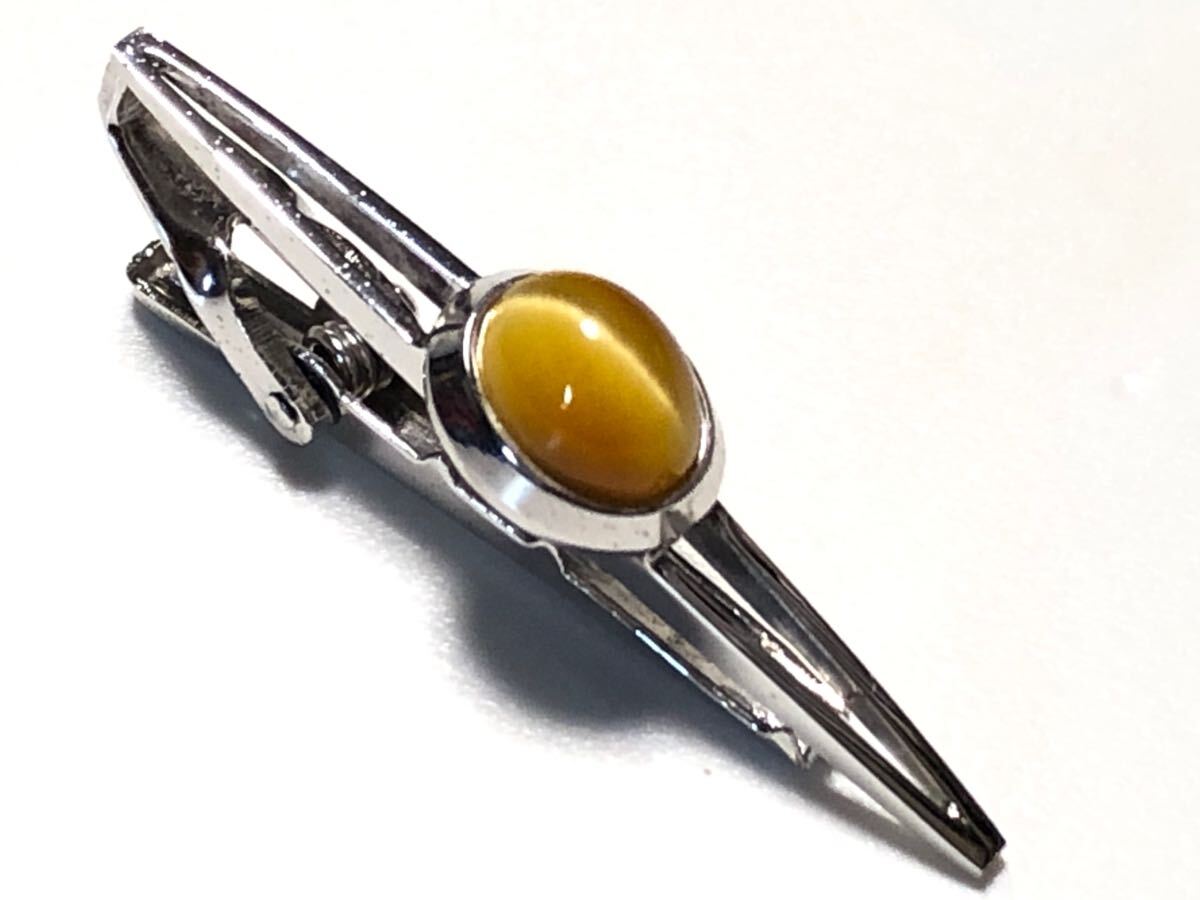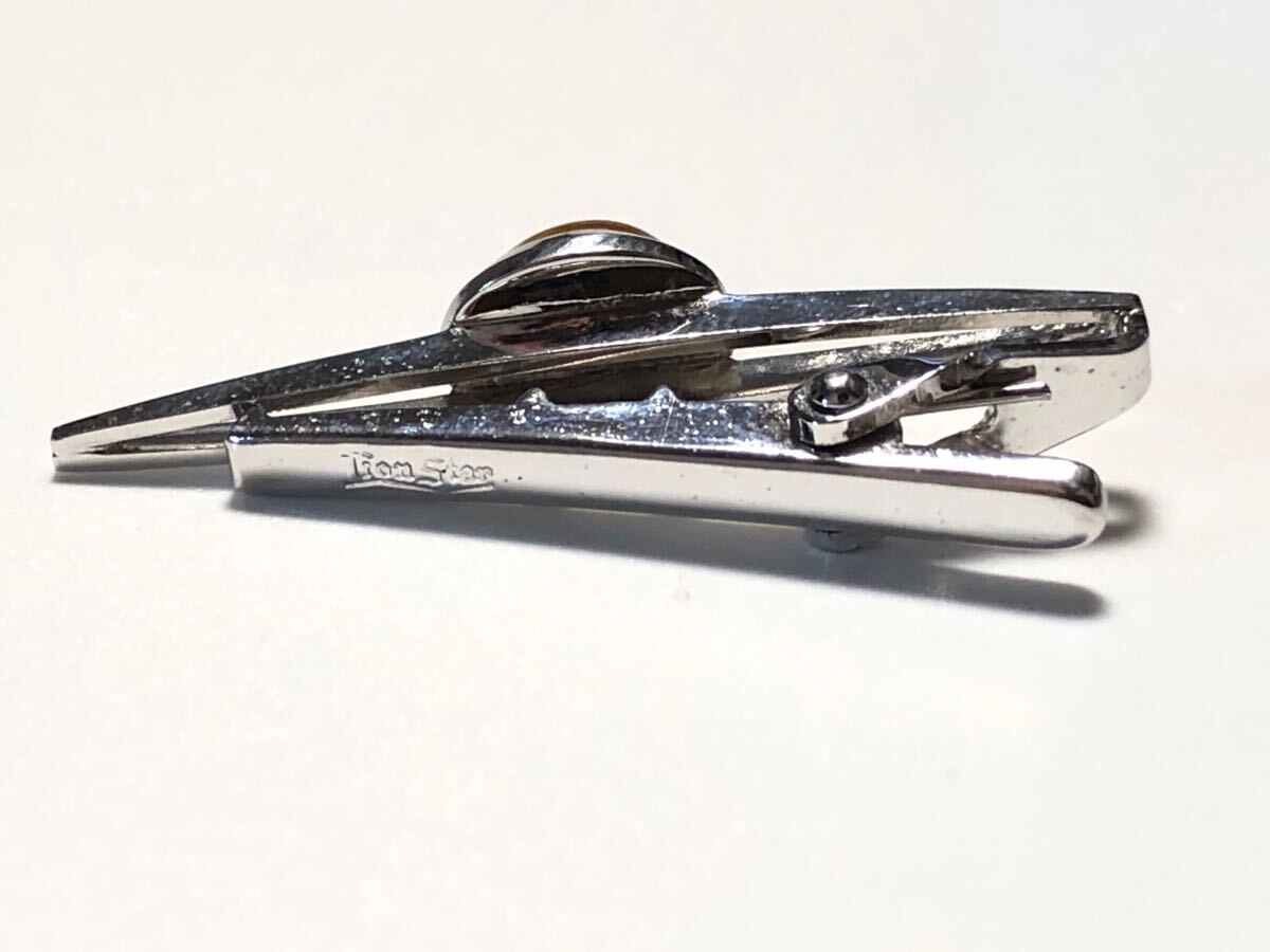 LionStarのブラウンキャッツアイを使用した、オーバルカボションカットのデザインタイピンです。金属面に若干のくすみがあります。