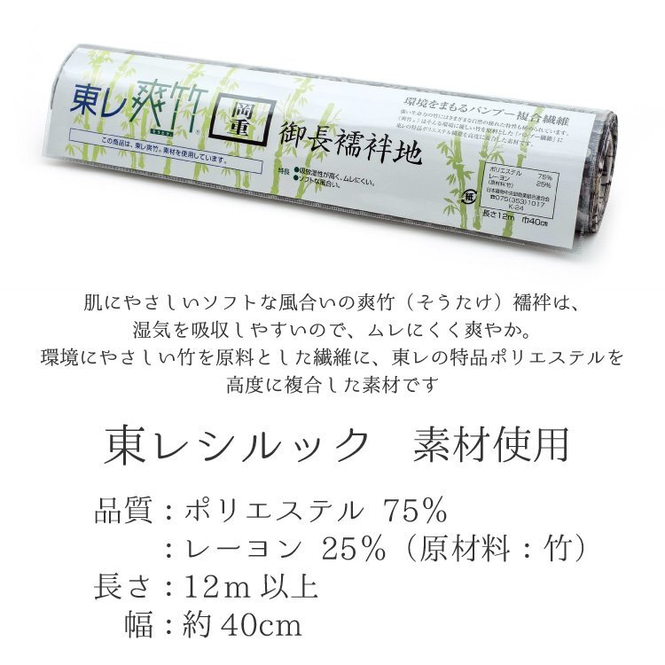 商品説明 | 東レシルック 爽竹の長襦袢です。 夏の素材となります。 夏の半衿を付けて夏物として着てもいいですし、冬の半衿を付けて、単衣用としても着れる襦袢地です。 爽竹は環境に優しい竹を原料とした「バンブー繊維」に東レの特品ポリエステル繊維を高度に複合した素材です。 特徴 ・吸放湿性が高くムレにくい ・ソフトな風合い |