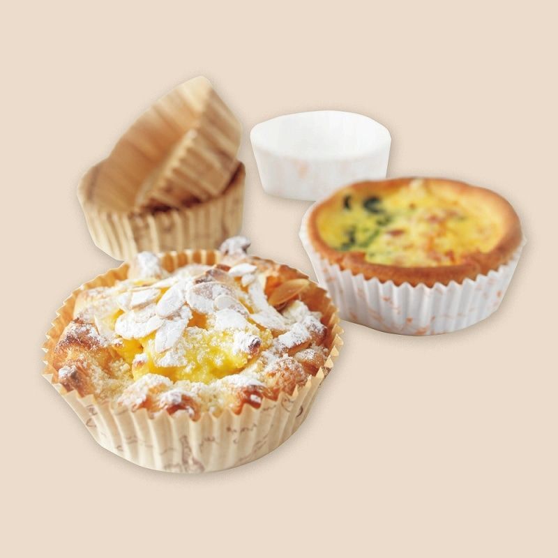 デニッシュ系の調理パンや焼き菓子におすすめの紙カップです。ベーカリーをイメージさせるイラストが入っています。