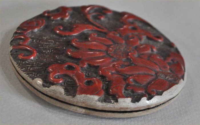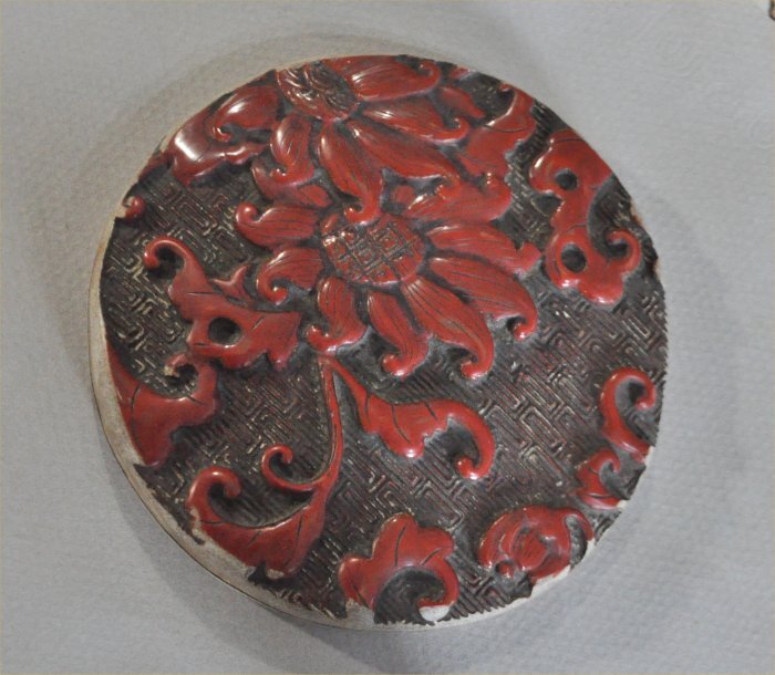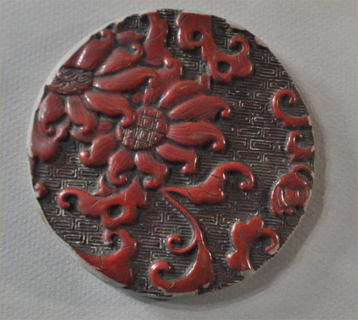 堆朱のベース100mm径サイズは、100mm径厚み10mm中国の古い時代の堆朱皿からベースを彫りだしました。裏側は黒漆です。立体的な模様の重厚なベースです。