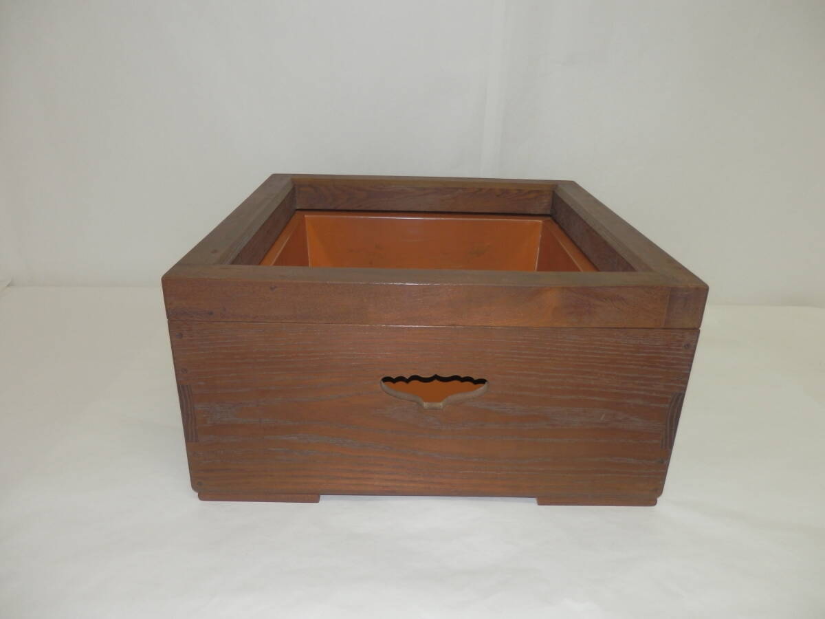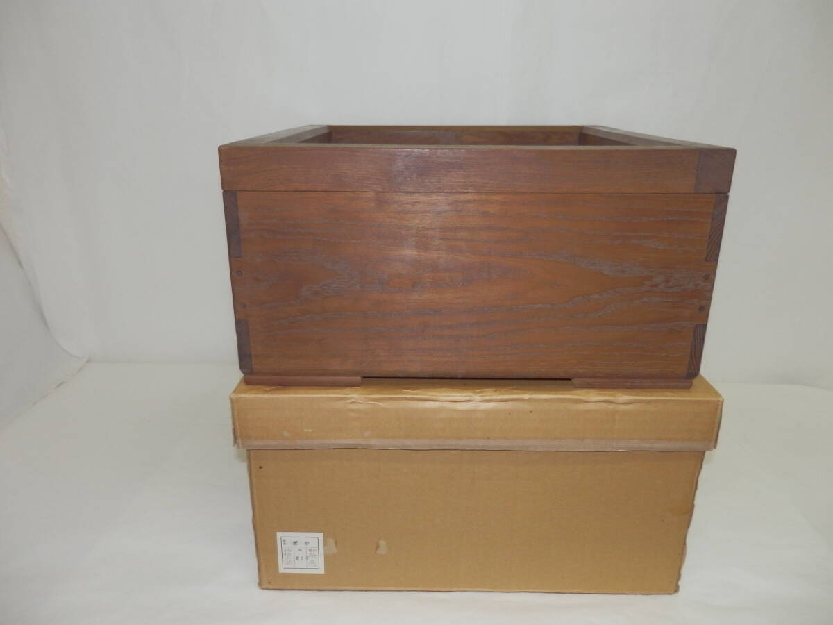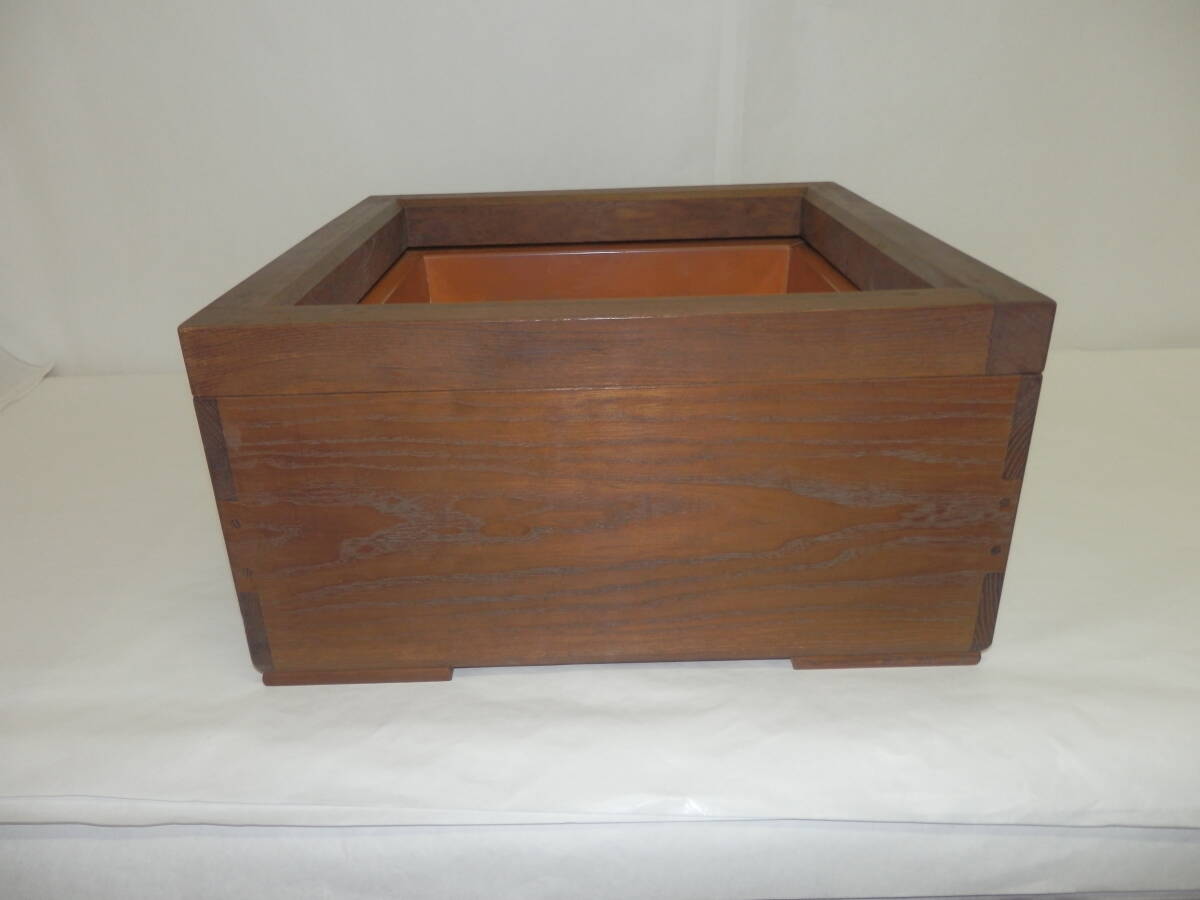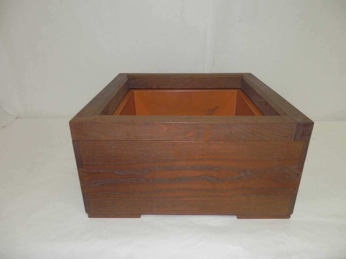「中古品・茶道具」女桑製の置炉です。銅オトシ{コード用ゴム穴付}です。 縦・横約39.7cm 全体高さ約20.3cm 銅オトシ 内法約30cm四方 深さ約13cm 紙箱「ヤケ、シミ等有」。 どうぞ宜しく。