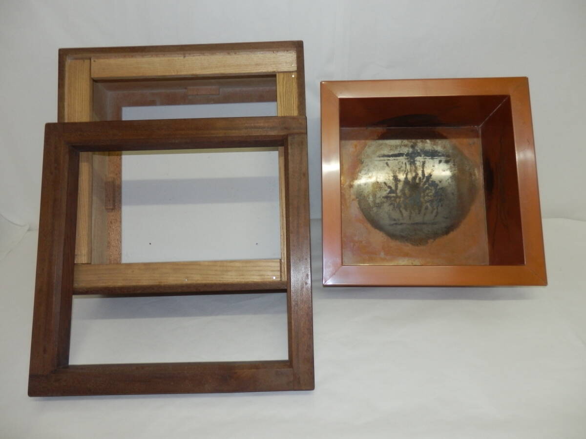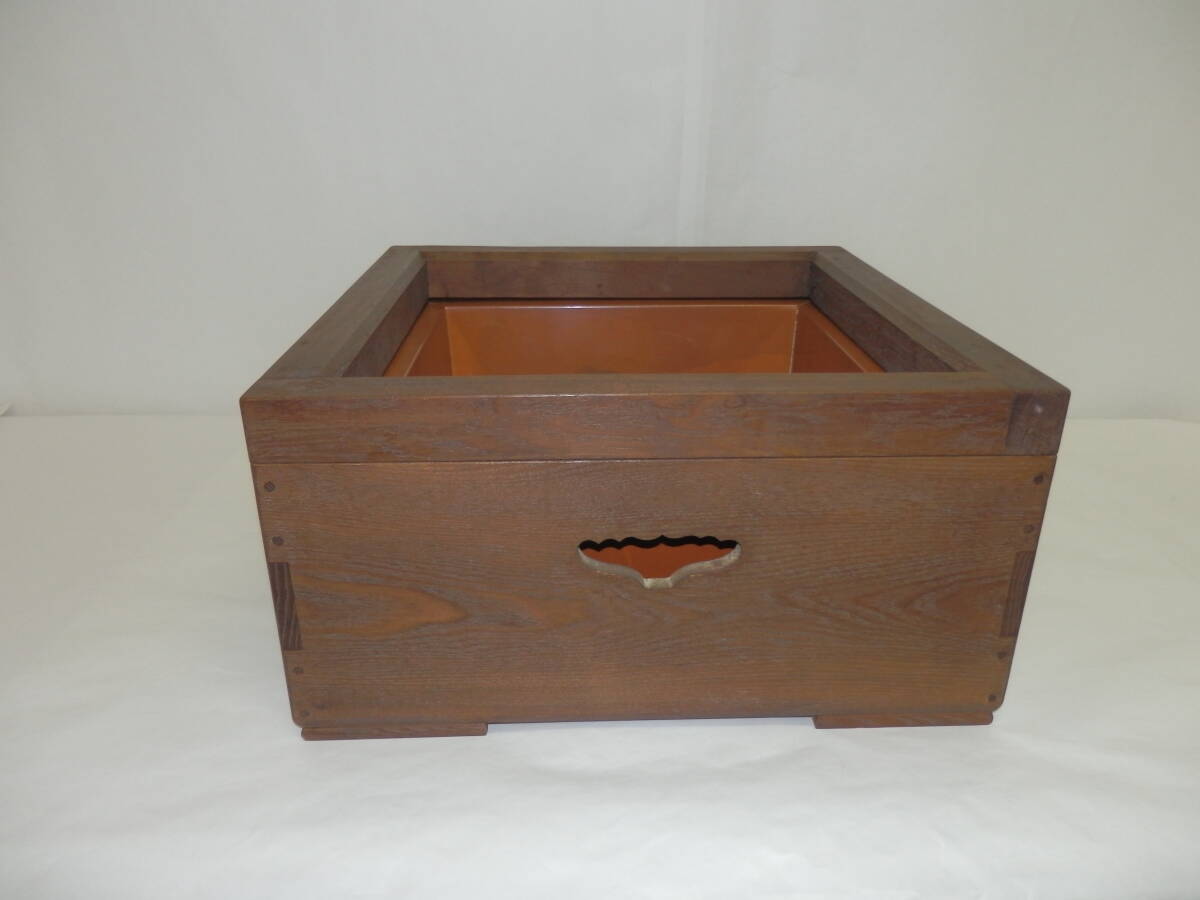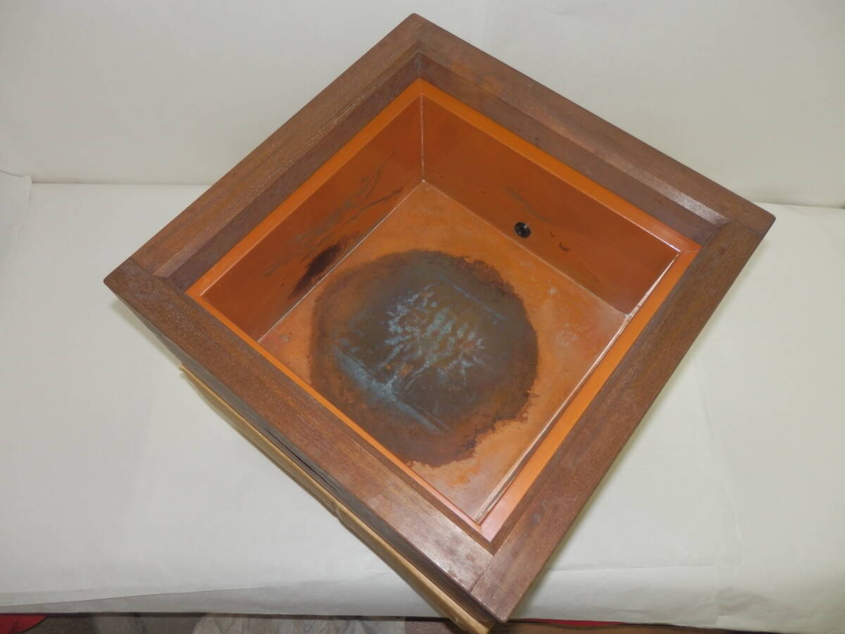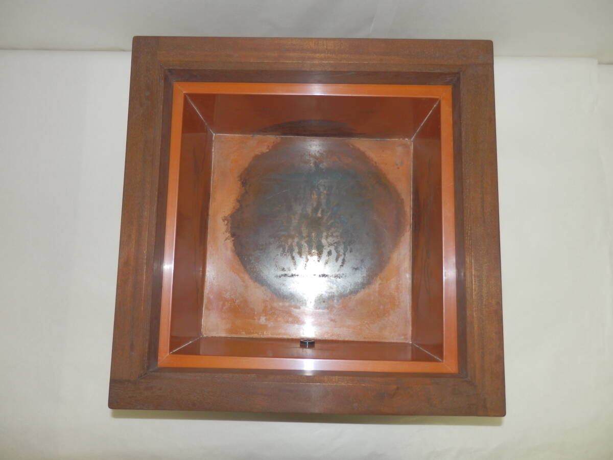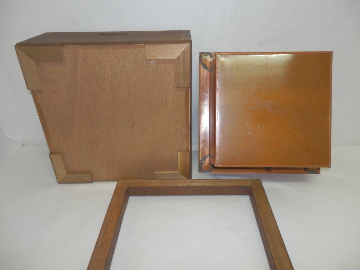 「中古品・茶道具」女桑製の置炉です。銅オトシ{コード用ゴム穴付}です。 縦・横約39.7cm 全体高さ約20.3cm 銅オトシ 内法約30cm四方 深さ約13cm 紙箱「ヤケ、シミ等有」。 どうぞ宜しく。