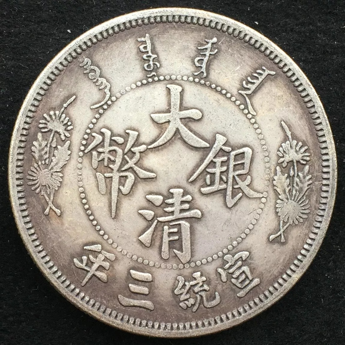 大清銀幣(壹圓銀貨)の表面の中央には「大清銀幣」という文字がしっかりと刻印されています。外側には、満州語と漢字で「宣統三年」と書かれています。そして、裏面にはとても印象的な龍の図柄が描かれていますね。大清銀幣(壹圓銀貨)は、清の宣統3年(1911年)に天津という場所でつくられました。