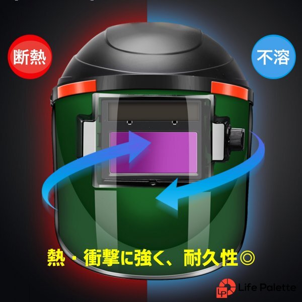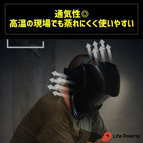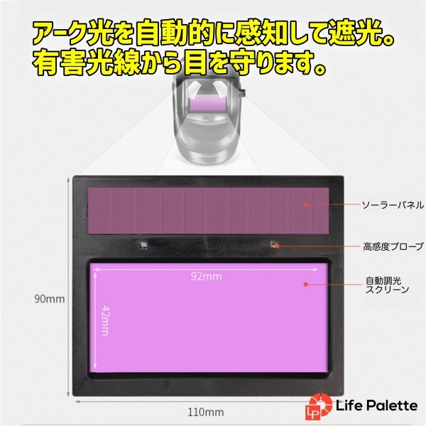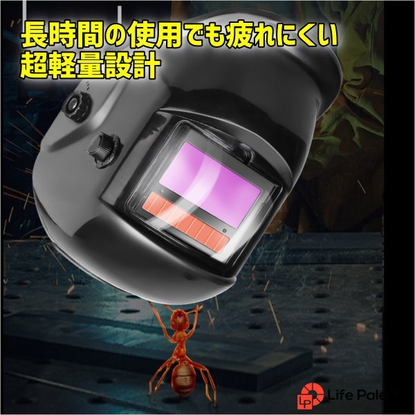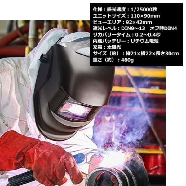 自動遮光溶接面 液晶フィルター 遮光速度1/25000秒 ソーラー充電式 溶接マスク ヘルメット 遮光面 アーク対応 アーク溶接 TIG MAG MIG OQ89 新品 送料:全国一律1500円(沖縄・離島を除く) 溶接時の有害光線を瞬時に遮光します。 ソーラー電池の採用により電池交換が不要です。 アーク光を受光するソーラー電池で頻繁な電池交換が不要です。 自動的に電源がON/OFFされます。 アーク光の発生と同時に遮光(反応)で有害光線から目を守ります。 【商品詳細】 仕様:感光速度:1/25000秒 ユニットサイズ:110×90mm ビューエリア:92×42mm 遮光レベル:DIN9~13 オフ時DIN4 リカバリータイム:0.2~0.4秒 内蔵バッテリー:リチウム電池 充電:太陽光 サイズ(約):縦21×横22×長さ30cm 重さ(約):480g =付属品= 収納袋、説明書(英文) ◆輸入品◆ 日本語取扱説明書は付属致しません。 取り扱いについてのサポートはご対応しておりません。 予めご了承くださいませ。 ★★溶接マスク続々出品中♪★★ | |||