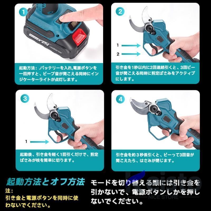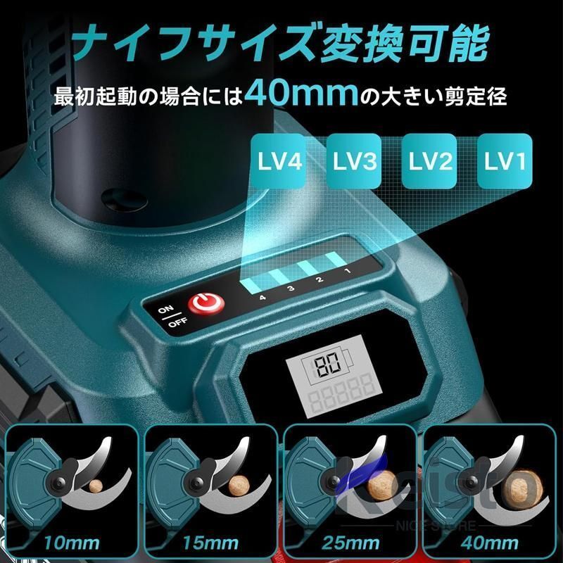 【ナイフサイズ変換可能】ナナイフサイズは10mm、15mm、25mm、40mmと いう三つのモードがあり、最初起動の場合には40mmの?きい剪定径、電源ボンタンを押すだけで、モードの切替が可能です。