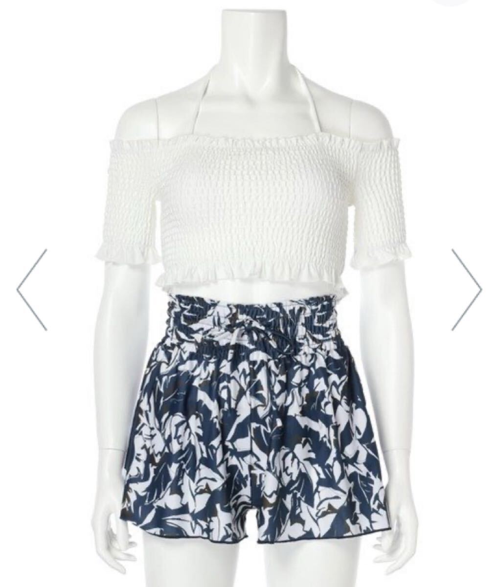ボディにフィットするシャーリングデザインで胸元をカバーして細見え効果アップ。ホルターネックとオフショルデザインの肌見せでオトナっぽく女性らしい華奢見えスタイルに。リーフ柄のショーツとショーパンが夏のリゾート気分を高めてくれます。
