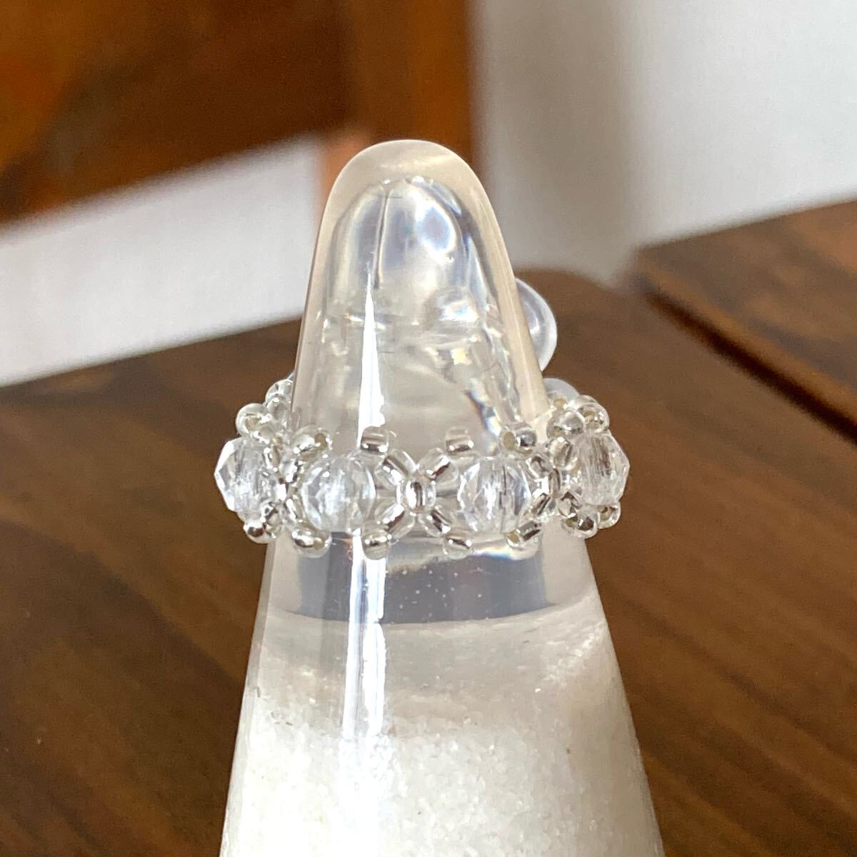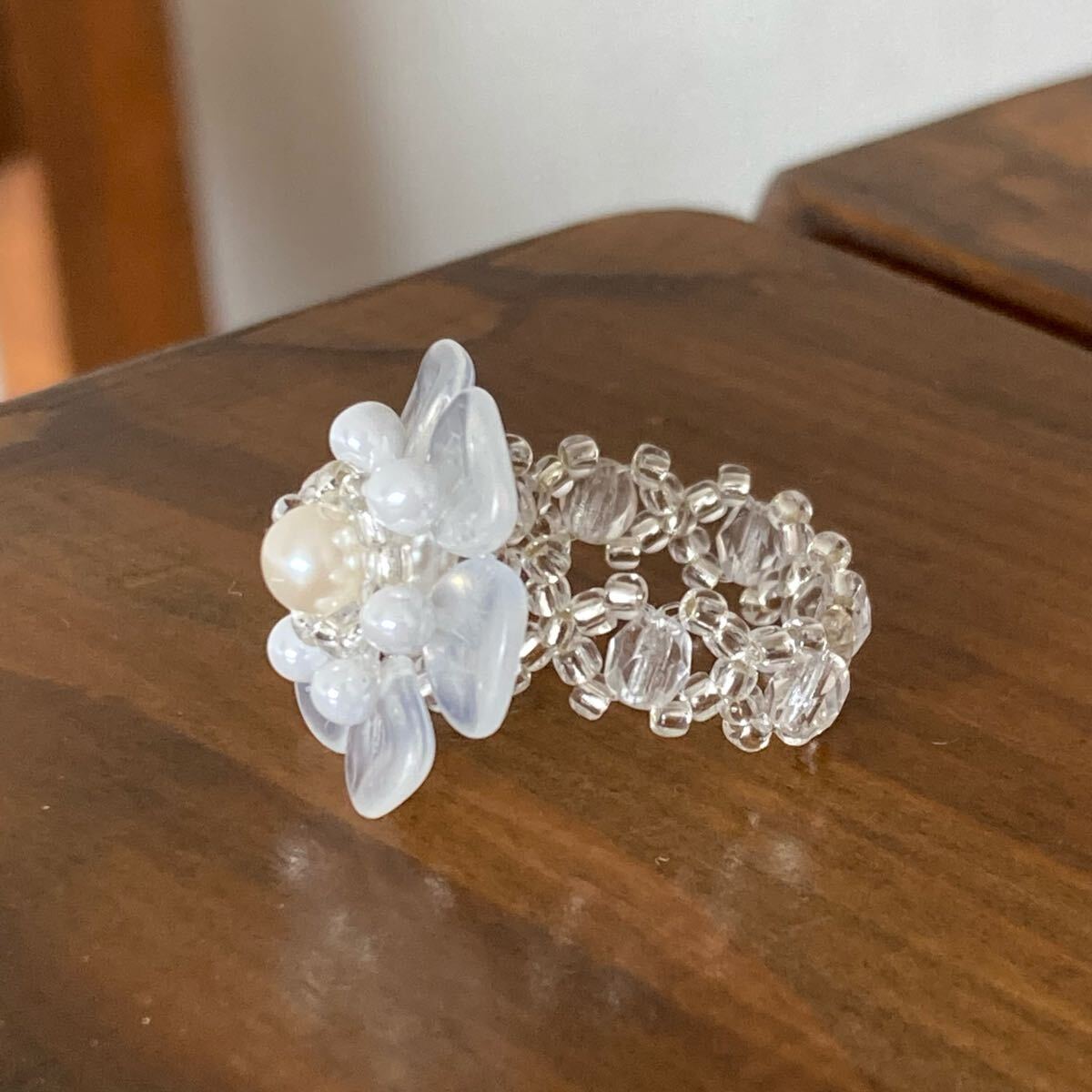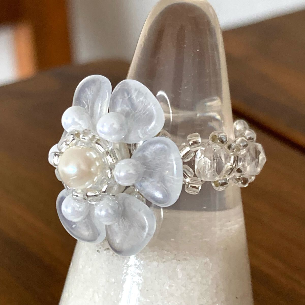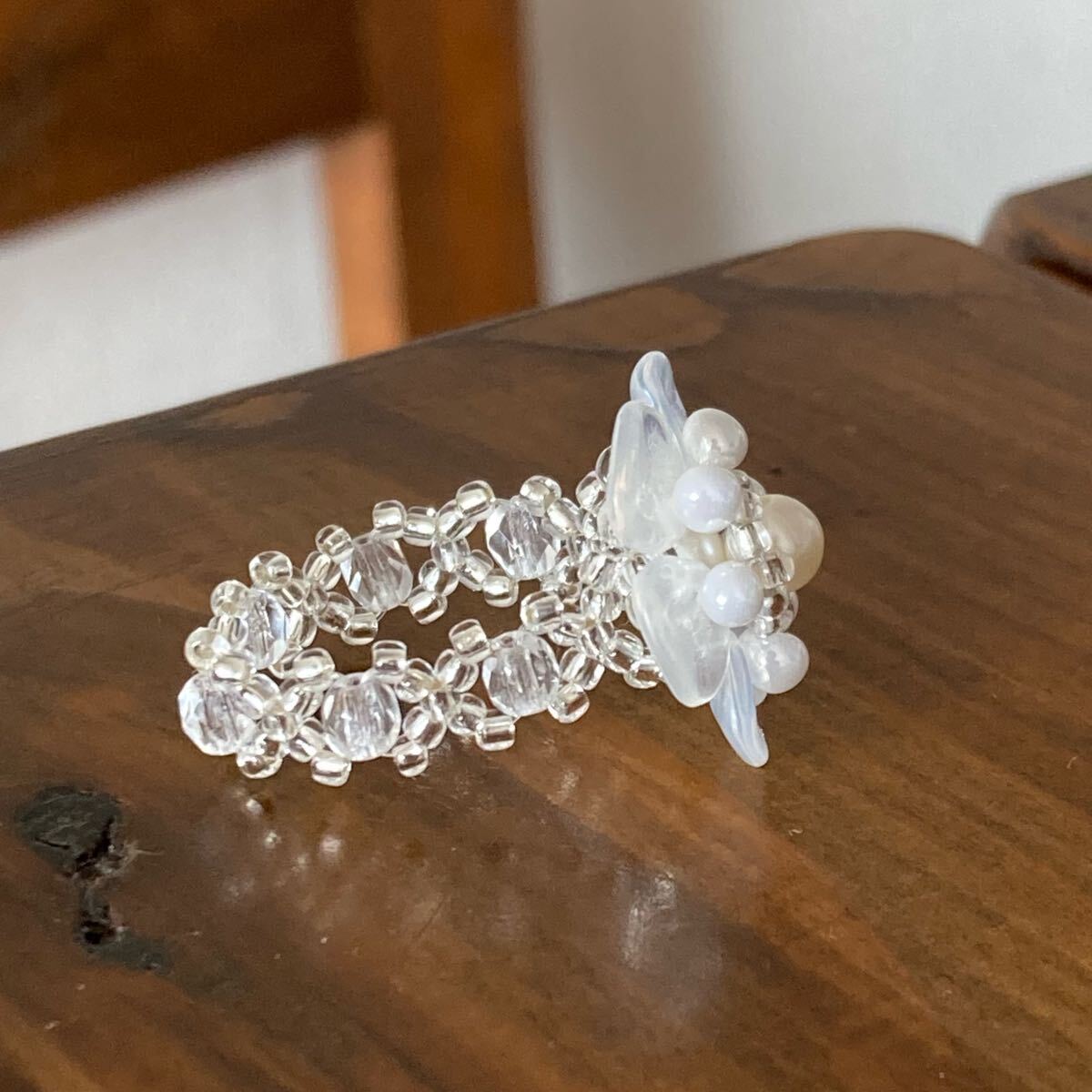 8mmのフロストホワイトの花びらビーズ、白のドロップビーズ、5mmの白のパールビーズ、4mmのクリアのチェコビーズ、クリアシルバーの丸小ビーズで作ったリングです。