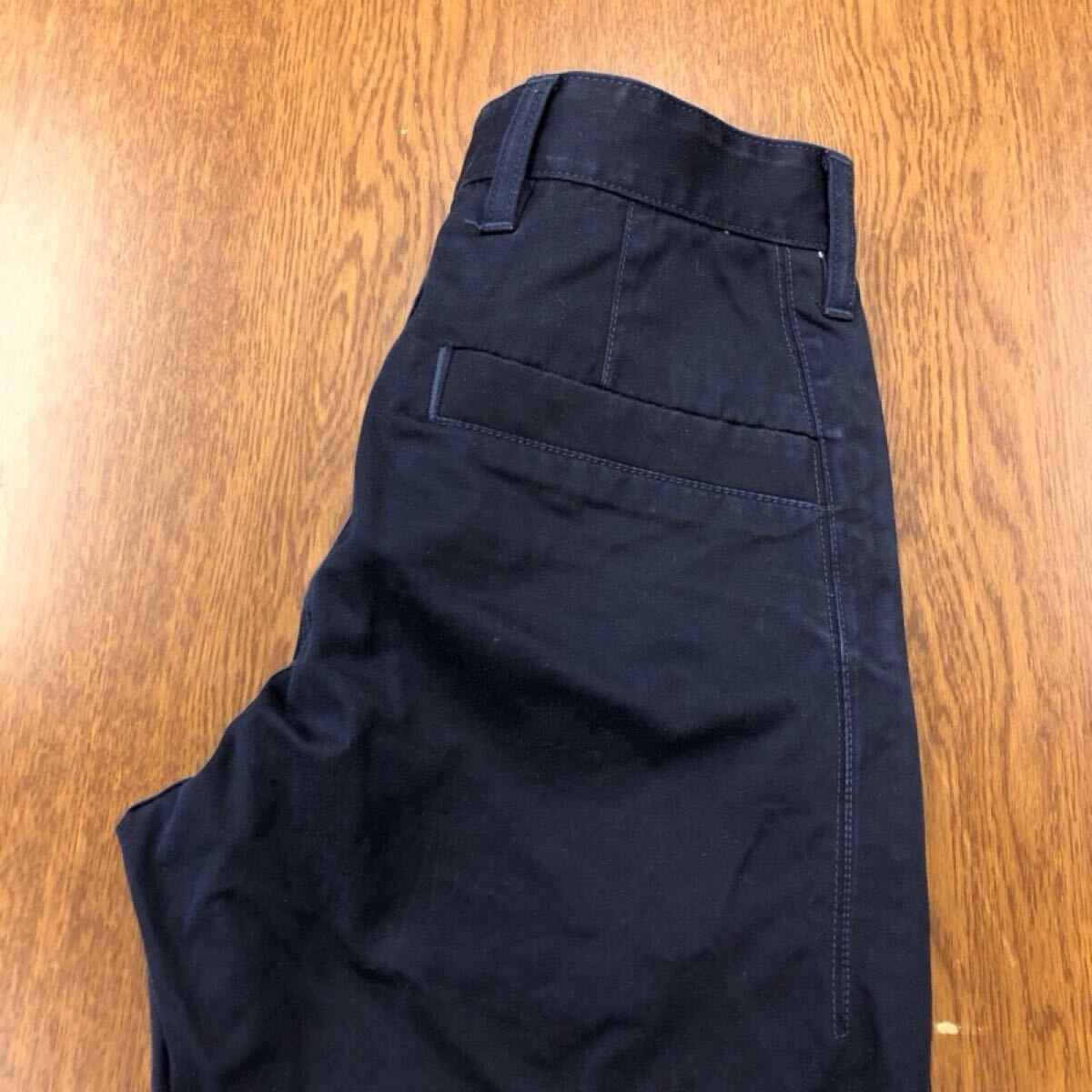 ●ウエスト→フロントボタンやジップは閉じ、ウエストの表中心と後ろ中心を合わせて机や床など平面な場所に置き、フラットに測れるよう生地を軽く手で押さえ、平置きしたパンツの左右端の最上部を計測、実寸した数値×2の表記をしてます。