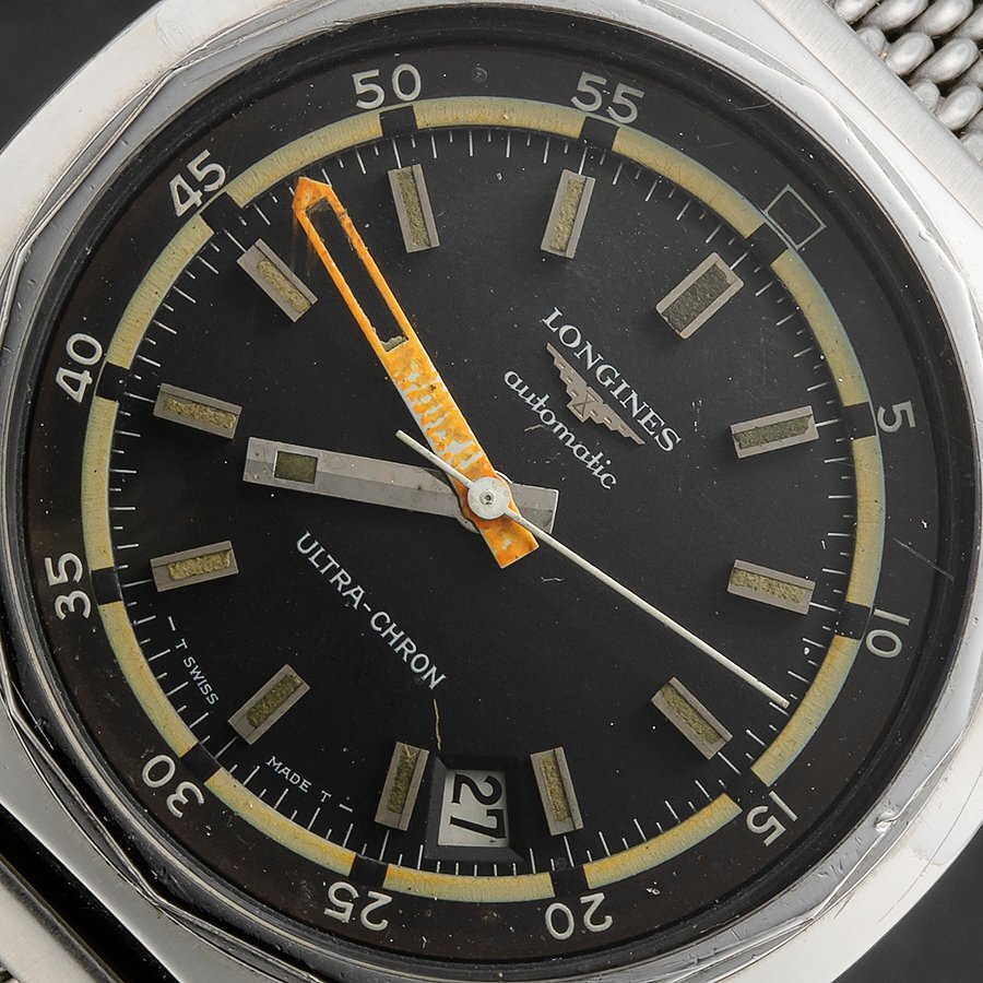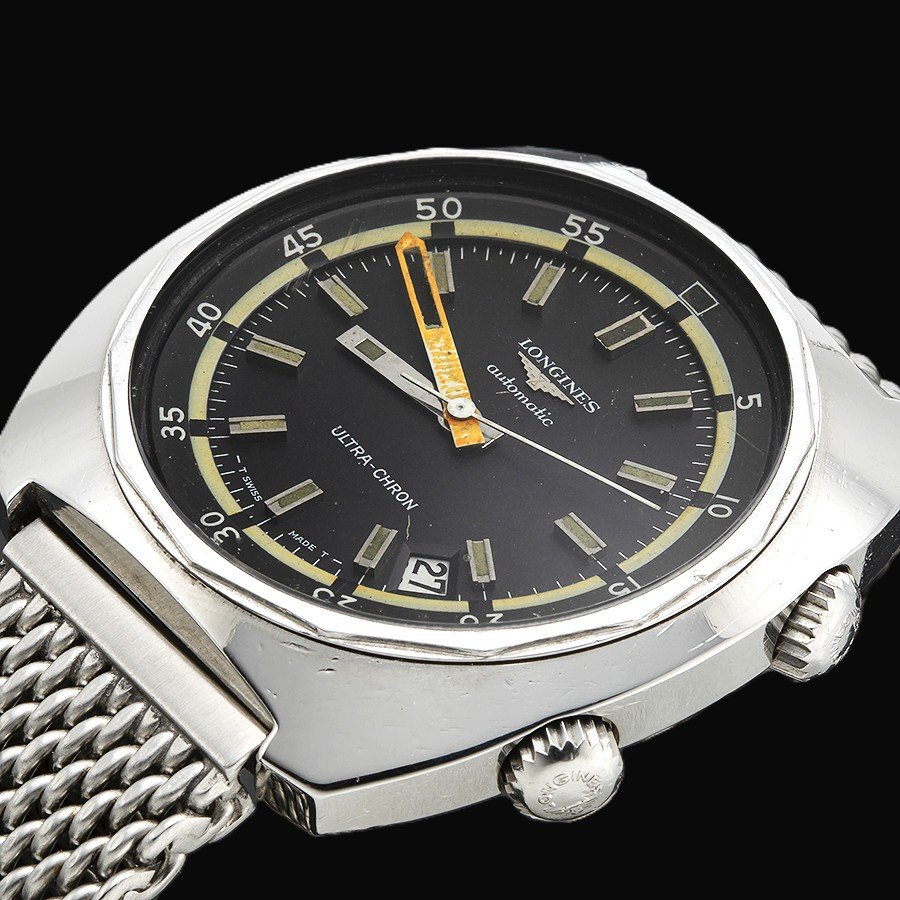 1950年代に入り、ロレックスやブランパンがそうだった通り、地球観測年の年に向け。地殻調査の為の潜水会社からの依頼で、海の中でも作業が出来るように本格的ダイバーウオッチを開発していった。当時100M防水から200M防水へとスペックは時計のダイバーズウオッチは増し、各社が独立した構想の元に本格的なプロ仕様のダイバーウオッチが開発されていった。それは伝説と呼ばれるモデルがロンジンからも登場する。それは登場する年代である。1968年というこの年に何故か不可解な現実が起こる。他ブランドは潜水時のボンベの残量時間を計測する仕様はダイバーズウオッチにはかかせないものだが、その残量計のスケールとして回転するスケールを用い、主にケースの外側にベゼルとして装備させたが、ロンジンはそのスケールであるベゼルが外である以上、海水中での作業時にケースから外れてしまう可能性があることに目をつけ、その回転ちするベゼルをケースの中に装備させたインナーベゼル式スケールを装備させることに成功した。そして分厚いケースの重量からなる振動を制御するために、ケースの内部に2重構造のインナーケースを入れ機械をしっかりとその振動から守っている。実はこの同年に全く同じ形状、同等のケース径、構造、重量までほぼ同等のモデルが同年に他社でも開発、発表された。IWCのアクアタイマー、ジラール・ペルゴのディープダイバー、ルクルトの防水モデルであるマスターマリーナからディープシー。ゼニスはお株のクロノグラフモデルにインナーベゼルを10時位置の竜頭で回転ざせるスーパーサブシーを発表した。他ウイトッナー、などかなりブラントドが何故か、同じようなモデルを同年に発表させたからである。これは実は1969年のオメガのアポロ月面プロジェクトでオフィシャル契約という20世紀最大のマーケットを獲得したことで、当時、このことがきっかけで、各社の開発情報への敏感な発信網を形成し、いち早く新作を出ることで、オメガ一党の時代の幕開けに対し敗者にならない為の熾烈な開発合戦となっていったのは言うまでもない。その中で、ロンジンが出しダイバーは何と、36000振動モデルを世界でいち早くモデル化したウルトラクロンに託したのである。それは “自動巻き”“36000振動””ウルトラクロン”という3本たての最高のモデルとして誕生した.特に目を引くのが、海水の中でも視認性を重要視したオレンジカラーの大きなスクエアー型の分針、分計測の大切さを実践的に考慮されたデザイン、酸素残量計となるインナーベゼルには夜光ではなく、蛍光塗料を採用し、いつでも塗り替えのサービスをできるようにした。トリチウムであると、塗り直しが太くなり難しいが、蛍光であると安易となるからだ。当然、41MMという大きすぎる、又腕にはめた瞬間にずしりとくるケースは腕にはめるでだけで、一瞬のうちに人の目を引くほどの存在間まるだしの最高のダイバーと言っても過言ではない。風防のミネラルグラス、文字盤、針、ケース、ブレス全て当時のままの状態である。