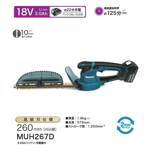 マキタ製の18V充電式ミニ生垣バリカン(ヘッジトリマ)のMUH267DWFです。