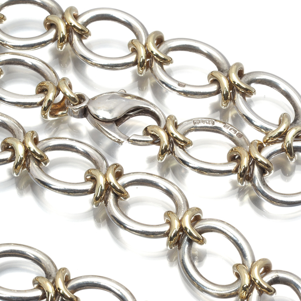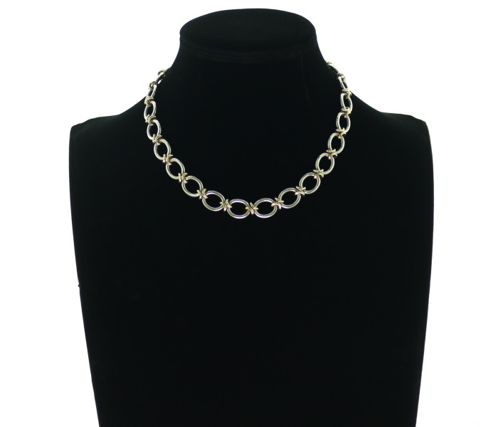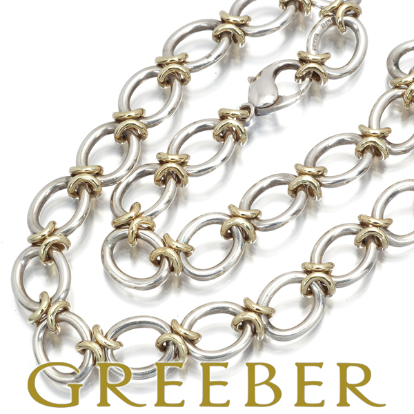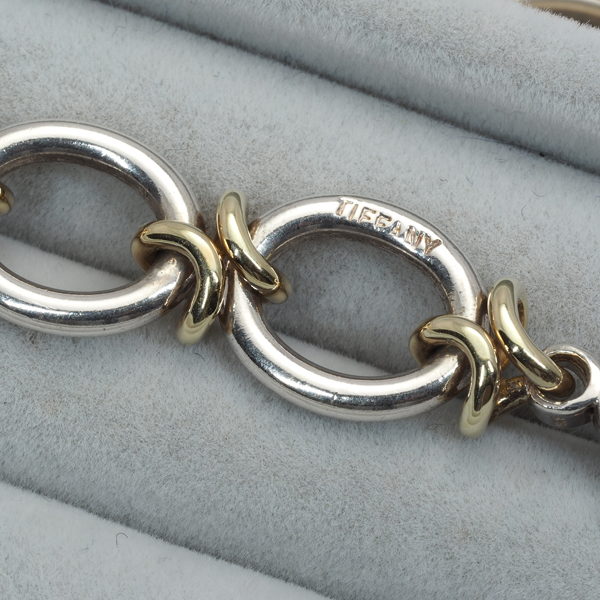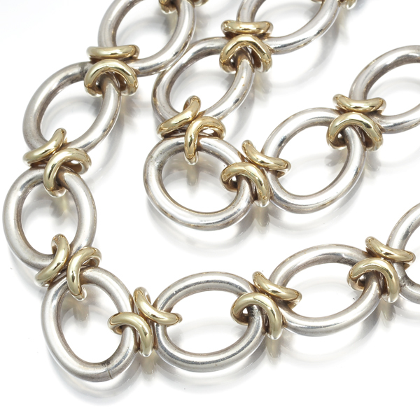 オーバルのシルバーパーツにイエローゴールドの連結パーツを使用したティファニーのヴィンテージジュエリー。胸元にボリューム溢れる輝きを与えてくれるレアな逸品です。 |