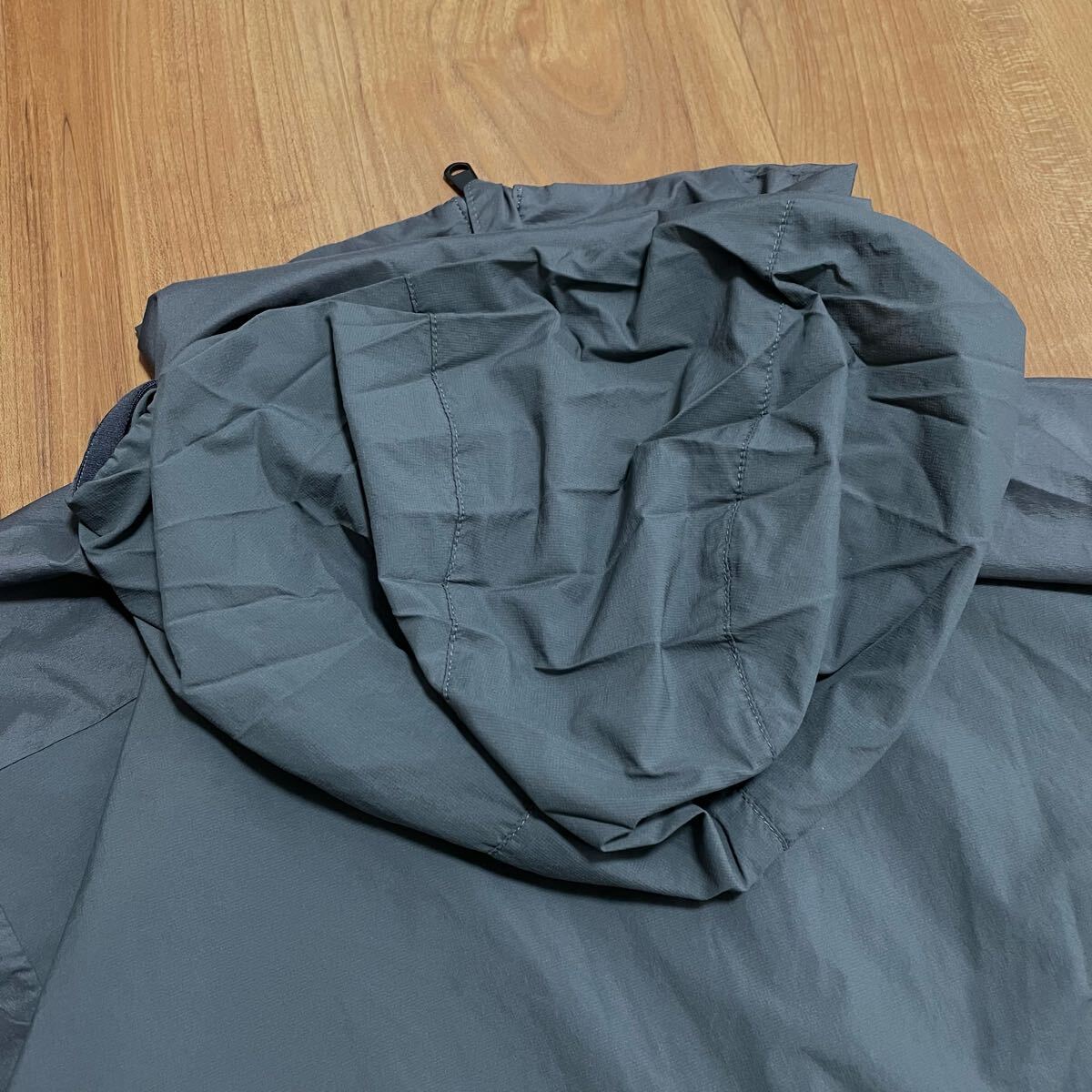 ふっくらとした襟には折り畳まれたフードが入っており、フードとしての実用性はもちろん襟を立体的に見せる効果。