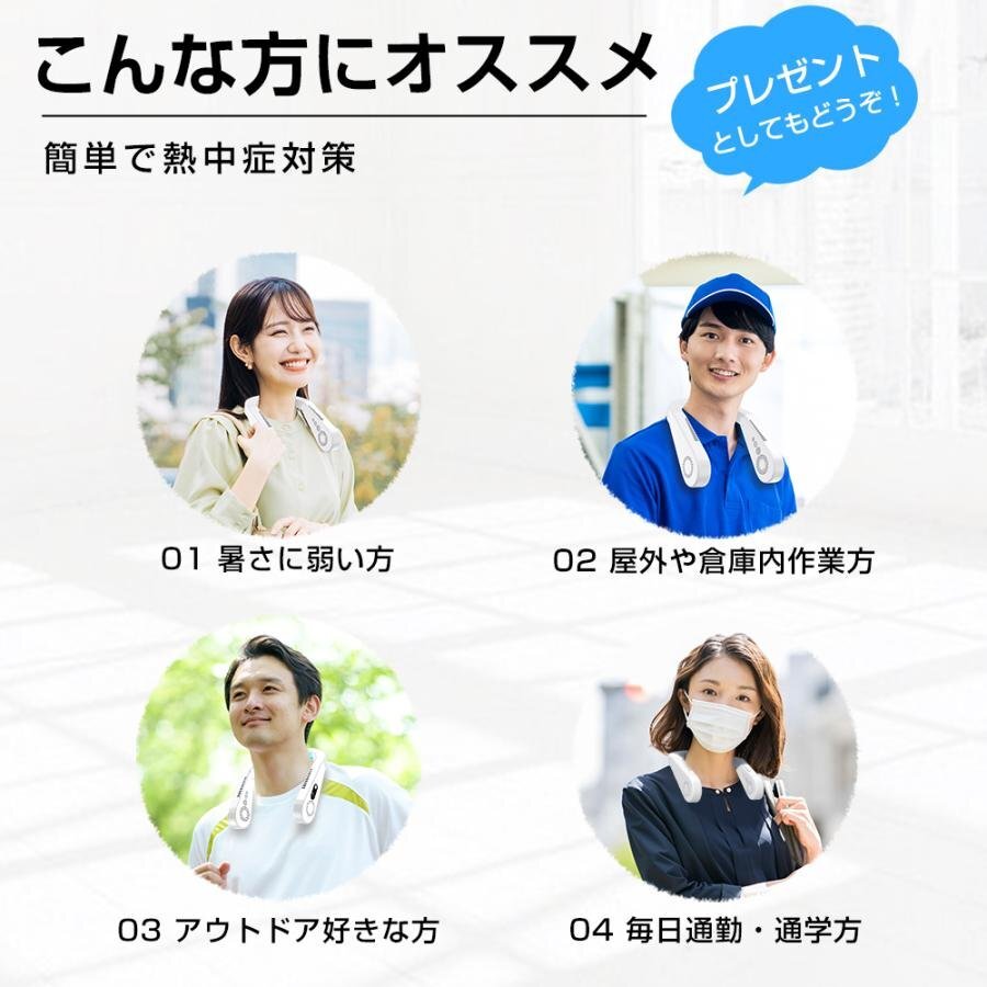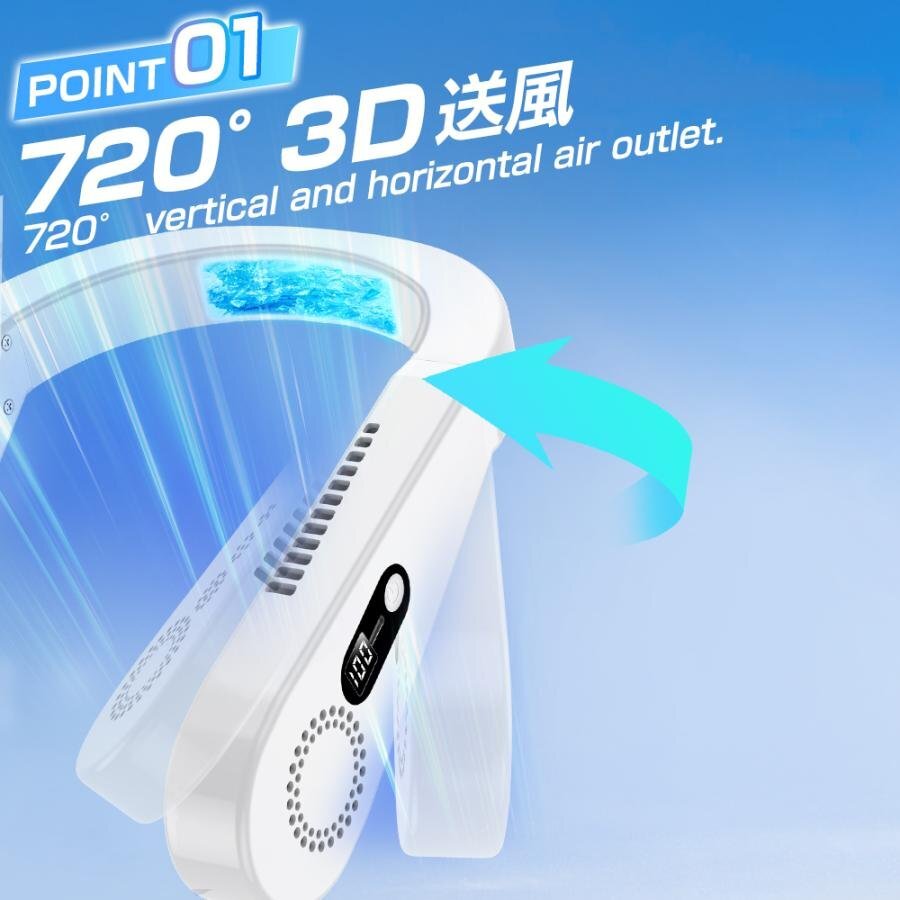 【720°全方位送風・静音設計】首かけ扇風機は720度全方位から風を送り、どの位置からでも均一に涼しい風を提供します。