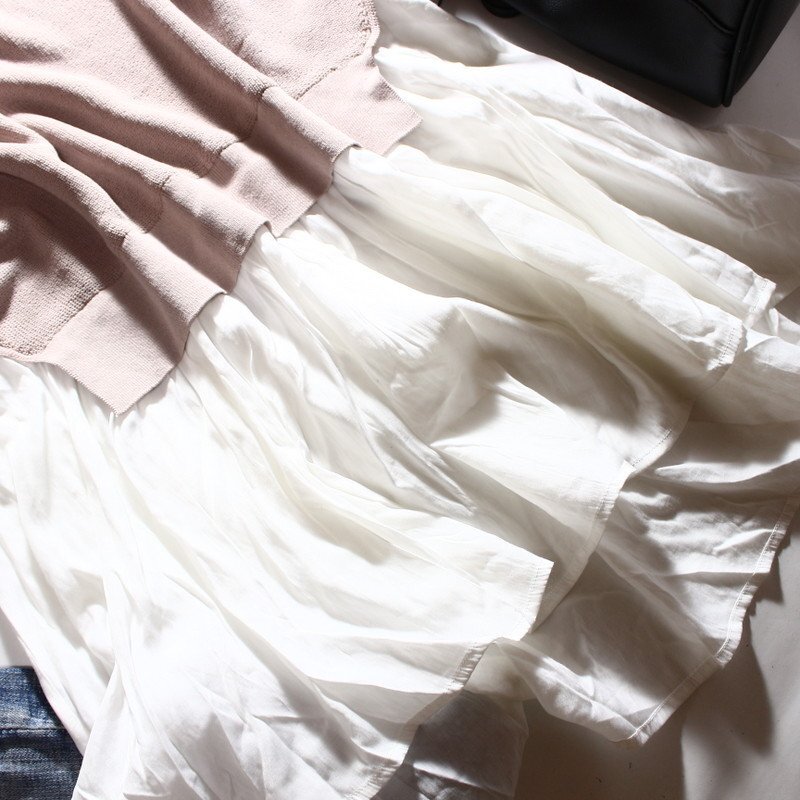 透け感のあるサマーニット×ほんのりシワ加工レーヨンシャツのドッキング、ロング丈のお洒落な1枚です。